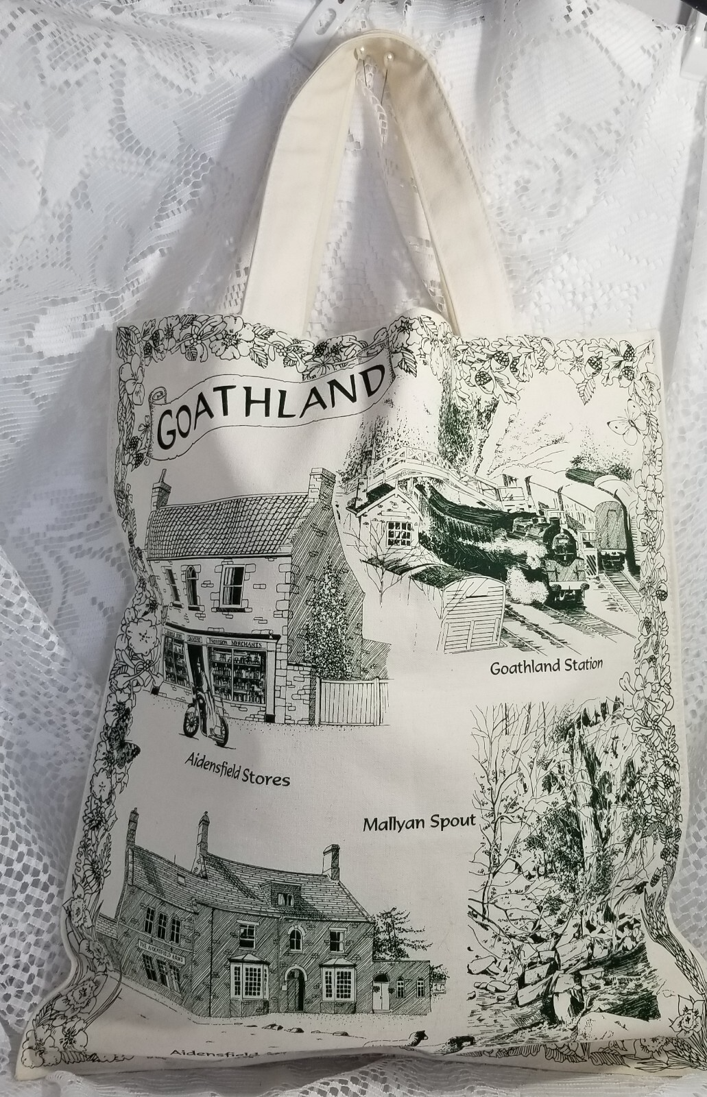 Great tote bag. Pattern is in dark green and is the same, front and back. Double handles, 7 inch drop. 162 grams. 15 x 17 inches; flat. Depicts scenes from Goathland, a village in the county of North Yorkshire, England. It is a mini spa town with people flocking to the 70-foot waterfall, Mallyan Spout, which today plunges down a wooded ravine.