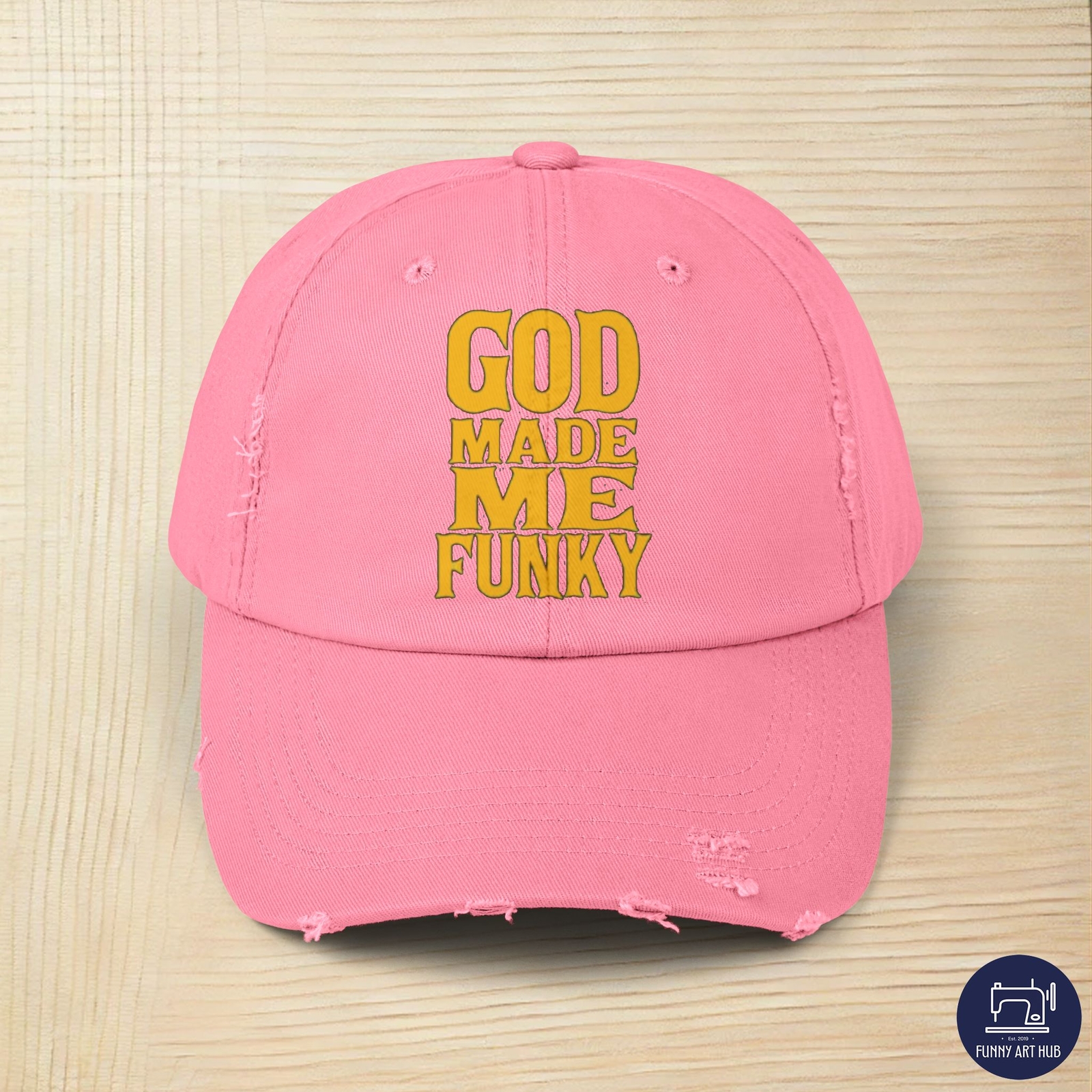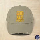 This is cool and funny gift 'God Made Me Funky' for men, women and kids who love no snacks, i'm out, food shortage, empty pantry, hungry, snack time, empty stomach, craving, kitchen depleted, snackless, munchies missing, hunger pangs, fridge empty, snack crisis, craving snacks, gift, cool, funny PRODUCT DESCRIPTION Made with 100% cotton twill for high-end comfort and durability, these custom distressed hats bring all the style and practicality one needs in daily life. The low profile along with the D-ring closure on a self-fabric hideaway strap ensures both proper protection from the sun and that perfect, adjustable fit. .: 100% cotton twill .: Sewn-in label .: Closure: self-fabric hideaway strap with metal D-ring slider .: Printed using Direct to Film (DTF) technology .: Please note: Due to a special finishing process, distress and color may vary SIZE GUIDE Imperial One size Crown height, in 6.50 Width of front panel, in 7.37 Bill length, in 2.87 Metric One size Crown height, in 16.51 Width of front panel, in 18.73 Bill length, in 7.30 PRODUCT DESCRIPTION Made with 100% cotton twill for high-end comfort and durability, these custom distressed hats bring all the style and practicality one needs in daily life. The low profile along with the D-ring closure on a self-fabric hideaway strap ensures both proper protection from the sun and that perfect, adjustable fit. .: 100% cotton twill .: Sewn-in label .: Closure: self-fabric hideaway strap with metal D-ring slider .: Printed using Direct to Film (DTF) technology .: Please note: Due to a special finishing process, distress and color may vary SIZE GUIDE Imperial One size Crown height, in 6.50 Width of front panel, in 7.37 Bill length, in 2.87 Metric One size Crown height, in 16.51 Width of front panel, in 18.73 Bill length, in 7.30