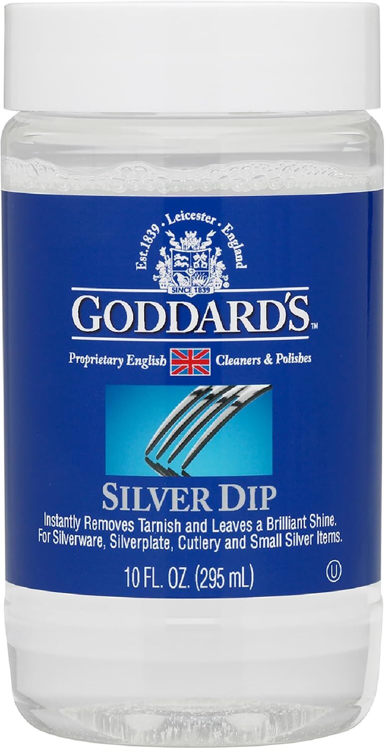 Goddard's Silver Dip is a powerful silver cleaner that removes stubborn tarnish and grime, restoring the original shine to submersible sterling silver or silver plated items. Scrub-Free Cleaning: Simply submerge your silver items into the liquid cleaner until all tarnish dissapears. No need to rub or buff with this silver cleaner and polish. Goddard's Silver Dip is perfect for cleaning intricate filigree, silverware, and jewelry including earrings, necklaces, and bracelets due to its ability to easily clean hard to reach spaces. Silver Dip is Goddard's strongest solution for fighting tough tarnish. Use sparingly on jewelry with glued fittings and wear gloves during use. For a gentler clean, use Goddard's Jewelry Cleaner. A Trusted Tradition: Joseph Goddard invented the world's first silver polish in 1839. Today, we honor his legacy by combining traditional excellence with today's advanced technology.