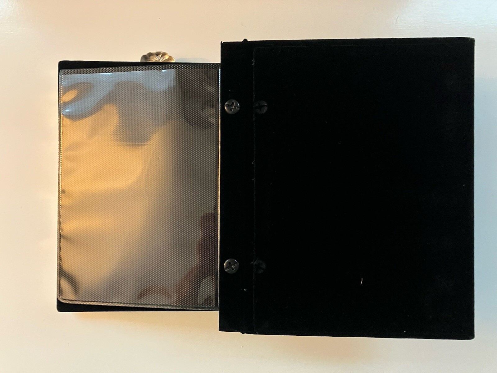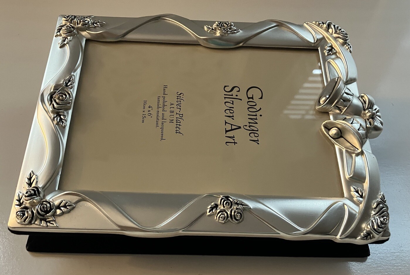 Capture the beautiful memories of your special day with this elegant Godinger silver plated satin finish photo album. It can hold up to 100 4"x6" photos, making it the perfect keepsake for your wedding day. The sleek design, glass front insert, black velvet backing and color of the album will complement any home decor, and the brand name Godinger ensures the highest quality. Whether you want to display the album on your coffee table or store it away safely, this piece is sure to impress. As a great addition to any home or wedding collection, it makes for the perfect gift. Measures 7.5” x 5.5” x 2”