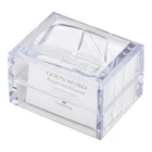God's Word Promise Box is filled with 140 daily prayers and scriptures to live by. Each card has a scripture from the KIng James Version of the Bible on one side and an accompanying prayer on the other. These encouraging reminders of God's goodness and His faithfulness will renew your spirit and refresh your soul year after year. You can be read them again and again or share them with the people you care about. They do make the perfect gift no matter the occasion. The cards are stored in a simply beautiful acrylic promise box with an embossed design of the Bible and the message,'God's Word,' on the top. Sample text: Bible verse: As I was with Moses, so I will be with thee. - JOSHUA 3:7 KJV Prayer: Dear Lord, please remove all doubt from my mind and help me to have faith in Your promises. Bible verse: The Lord is thy keeper: the Lord is thy shade upon thy right hand. - PSALM 121:5 Prayer: We thank You, Father, for loving us so much that You bring answers in all areas of our lives. Product Details Receive a daily dose of encouragement year after year with this acrylic Promise Box filled with scripture and prayers. Be inspired by a hopeful message every day. 140 2-Sided Scripture prayer cards in an elegantly designed acrlic Promise Box size: 3 3/4" x 2 1/2" x 2 3/4". The removeable lid has an embossed floral design with the message, "God's Gifts". Not only are your cards protected, they're are also easily accessible and portable. They make a beautiful tabletop, desktop or shelf display at home or in the office. Each Bible verse card features KJV Scripture text. These cards can be used as daily encouragement, Scripture memory, or pass one along to inspire your friends or family. It's the word of God at your fingertips. You may find yourself ordering more as these are the perfect inspirational gift for your friends and family on any occasion. Receive a daily dose of encouragement year after year KJV Scripture text Size: 3 3/4" x 2 1/2" x 2 3/4" 140 2-Sided Cards Acrylic box with removable lid Receive a daily dose of encouragement year after year with this acrylic Promise Box filled with scripture and prayers. Be inspired by a hopeful message every day. 140 2-Sided Scripture prayer cards in an elegantly designed acrlic Promise Box size: 3 3/4" x 2 1/2" x 2 3/4". The removeable lid has an embossed floral design with the message, "God's Gifts". Not only are your cards protected, they're are also easily accessible and portable. They make a beautiful tabletop, desktop or shelf display at home or in the office. Each Bible verse card features KJV Scripture text. These cards can be used as daily encouragement, Scripture memory, or pass one along to inspire your friends or family. It's the word of God at your fingertips. You may find yourself ordering more as these are the perfect inspirational gift for your friends and family on any occasion. Receive a daily dose of encouragement year after year
