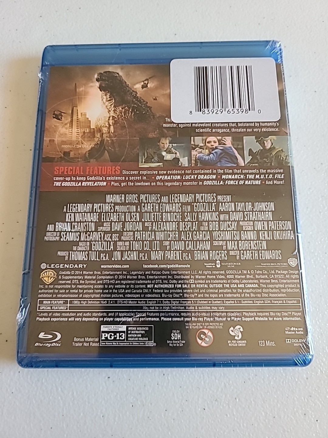 This Blu-ray edition of the 2014 movie "Godzilla" is a must-have for fans of the action, adventure, and science fiction genres. Directed by Gareth Edwards, this PG-13 rated movie features a star-studded cast including Bryan Cranston, Elizabeth Olsen, and Aaron Taylor-Johnson. With a run time of 123 minutes, this additional scenes edition is presented in English language and includes subtitles in English, French, and Spanish. The Blu-ray is compatible with Region A players and is in brand new, factory-sealed condition. Add this creature-filled disaster movie to your collection today!
