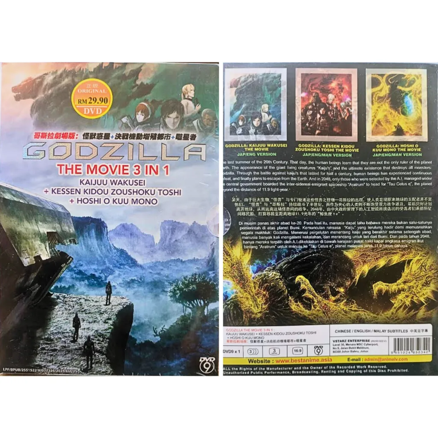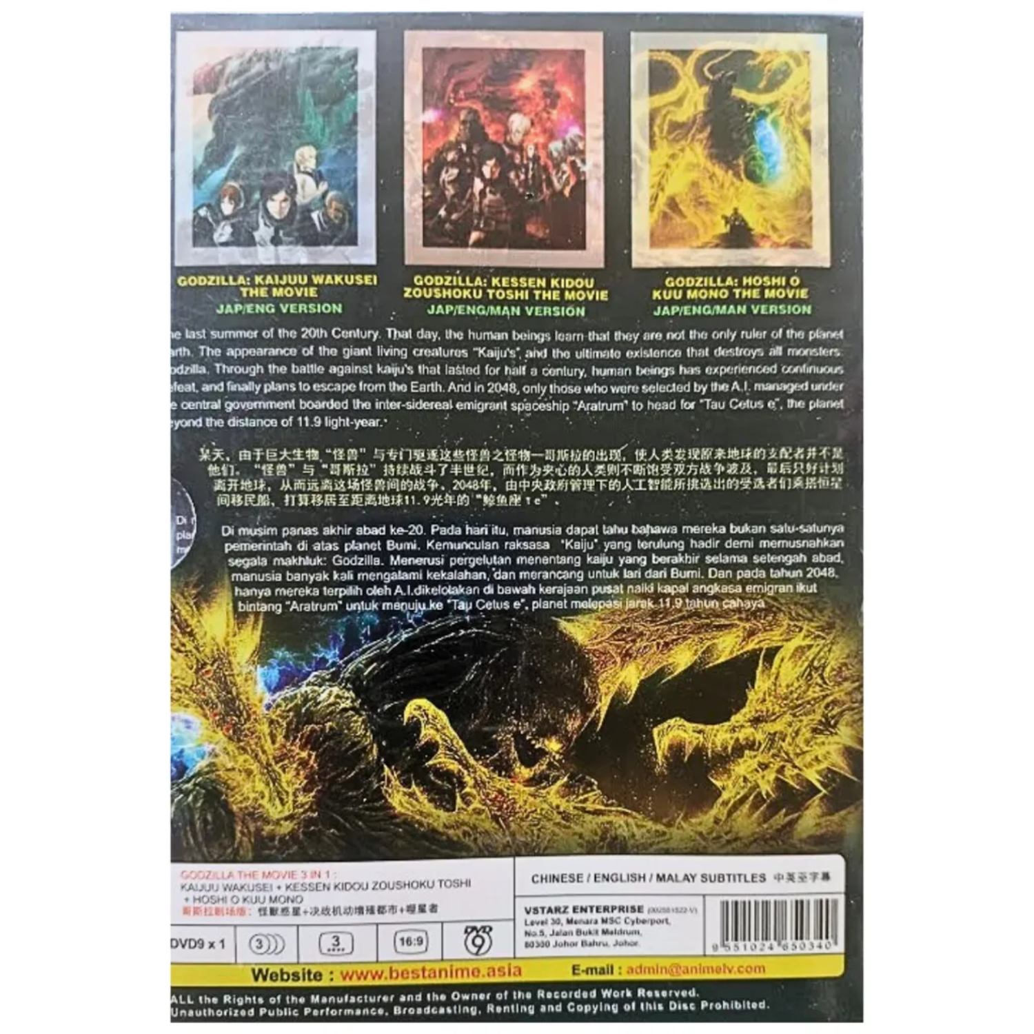 DVD GODZILLA THE MOVIE 3 IN 1 - ANIME MOVIE BOX SET (ENG DUB) The DVD Godzilla The Movie 3 in 1 - Anime Movie Box Set features a tall/DVD case with an R - 17+ rating for violence and profanity. The set includes three movies in English, Chinese, and Malay subtitles, directed by Hiroyuki Seshita. It is an action-adventure anime series with English and Japanese language options, released in 2017. The box set is a complete series collection with a region-free DVD format. Godzilla The Movie 3 in 1: Kaijuu Wakusei / Kessen Kidou Zoushoku Toshi / Hoshi wo Kuu Mono - *English Dubbed* Product Description: Number of Disc. : 1 DVD Episodes : 3 Movies Audio (Dialogue): English / Japanese Subtitled : English / Chinese / Malay DVD Region Code : Region Free, All (NTSC) Payment we only via accept payment via ebay manage payment Shipping We ship using Economy Shipping from Malaysia which takes 11 to 23 business days to reached customers. We also provide Express shipping from Malaysia which we used DHL Express with estimated time arrival up to 5 business days. Return Our policy aligns with eBay's professional law standards. Buyers covered by the eBay Money Back Guarantee are eligible for refunds in these situations: damaged item, item not matching the description, or wrong item. To initiate a refund, provide evidence of shipping damage and save the packaging. If you no longer want the item, we accept returns as long as it's in the same condition as when shipped. Refunds will be issued minus the original shipping cost. Return the item within the specified period, with no missing parts or damage to the packaging. Once the item is delivered and in satisfactory condition, a refund will be issued within 2 days. Unreasonable circumstances or failure to meet conditions may result in a non-accepted return Feedback: As we are a serious seller, please contact us to resolve any bad issue before leaving neutral or negative feedback. Hope you understand that sometimes certain situation is beyond our control but we will still try our very best to solve it for you. Thank you for your business!