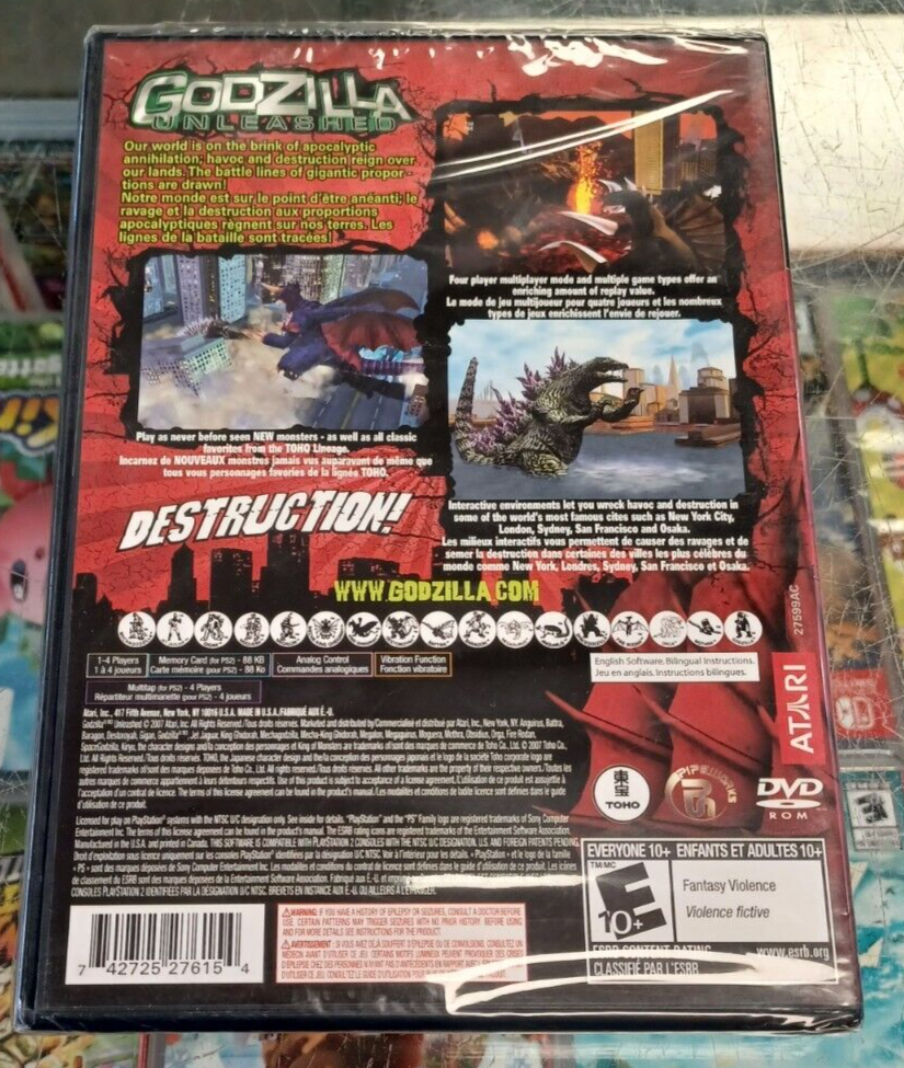 Publisher: Atari Inc. Release Year: 2007 Game Name: Godzilla: Unleashed Country/Region of Manufacture: USA Rating: E10+ (Everyone 10+) UPC: 3546430134238, 0742725275997 ESRB Descriptor: Fantasy Violence Platform: Sony PlayStation 2 gtin13: 0742725275997 Genre: Action & Adventure Control Elements: Gamepad/Joystick brand: Atari Inc. Number of Players: 1-4