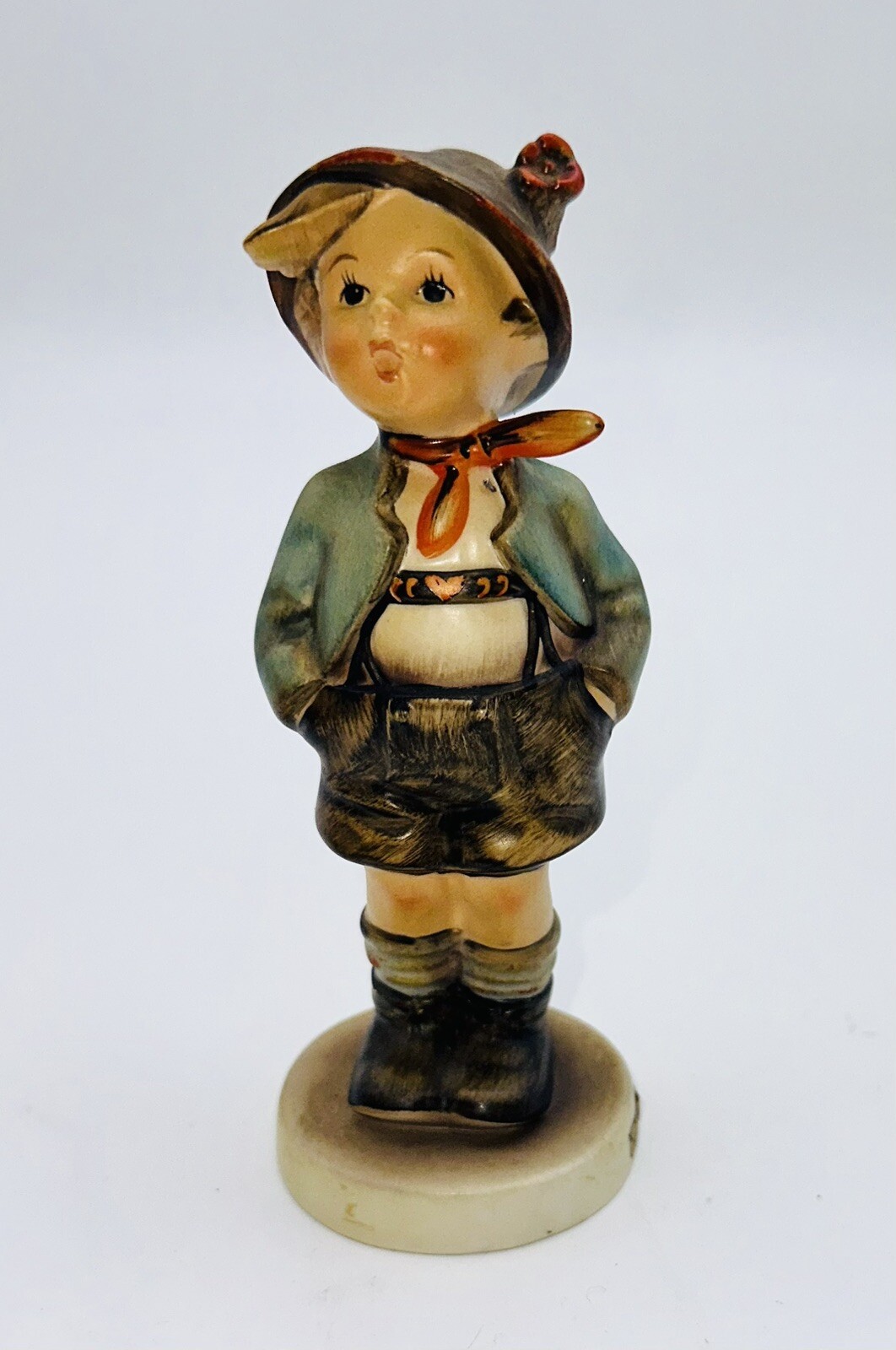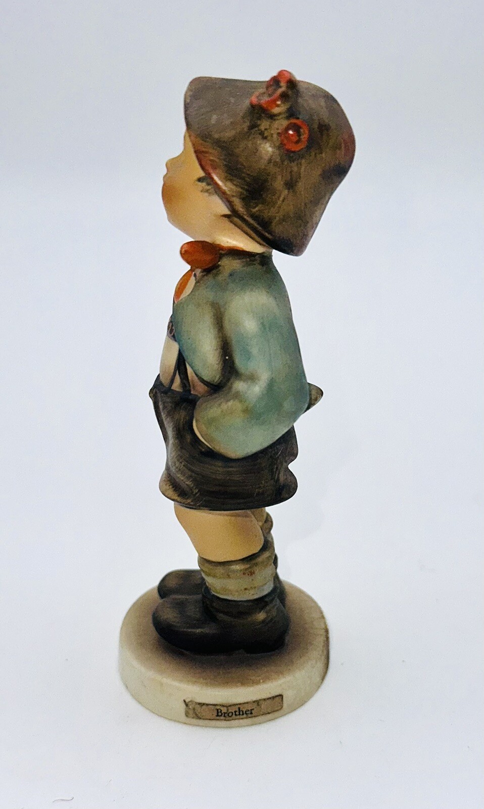 This Goebel Hummel figurine depicts a brother and is made of porcelain. The multicolor figurine is 5 inches tall and 2 inches long. It features an all-over pattern and is an original piece from Germany. The figurine is unboxed and has no modifications. It is a perfect collectible for all occasions and is a great addition to any décor.