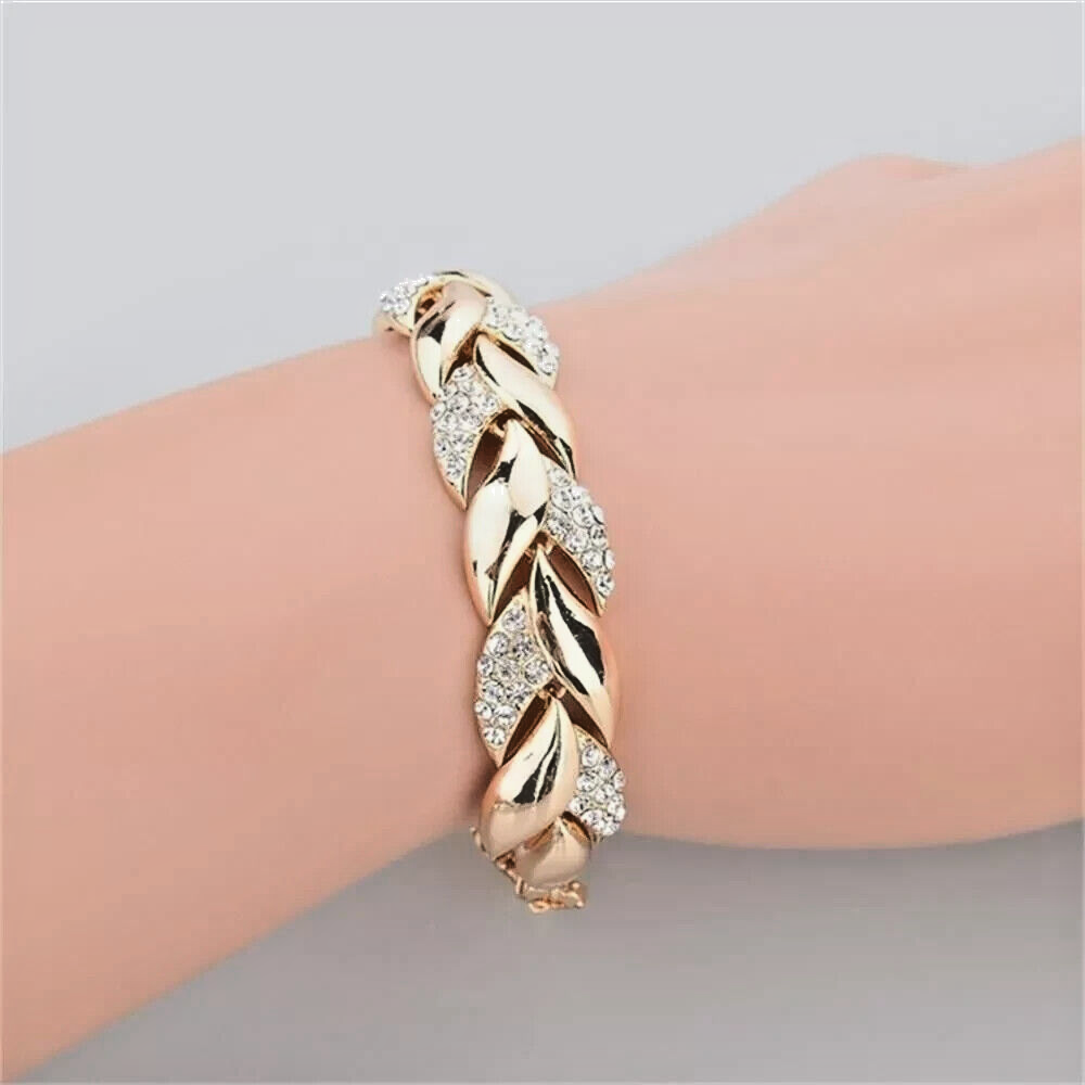 Luxury Braided Gold Coloured Leaf Bracelet Crystal Charm Wedding Bracelet for Women Description: Add a touch of elegance to your jewellery collection with our Luxury Love Braided Leaf Bracelet . This stunning bracelet features a beautiful braided design, adorned with high-quality rhinestones and a charming love pendant. Perfect for weddings, parties, or everyday wear, this piece is a versatile addition to any outfit. Key Features: Materials: Made from durable zinc alloy and shimmering rhinestones for a luxurious finish Design: Intricate braided chain with a lovely charm, enhancing its elegance Size: Adjustable length of 15-20cm, ideal for wearing solo or layered with other bracelets This exquisite bracelet is a must-have for women who appreciate luxury and sophistication. It also makes a thoughtful gift for birthdays, anniversaries, or special occasions.