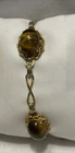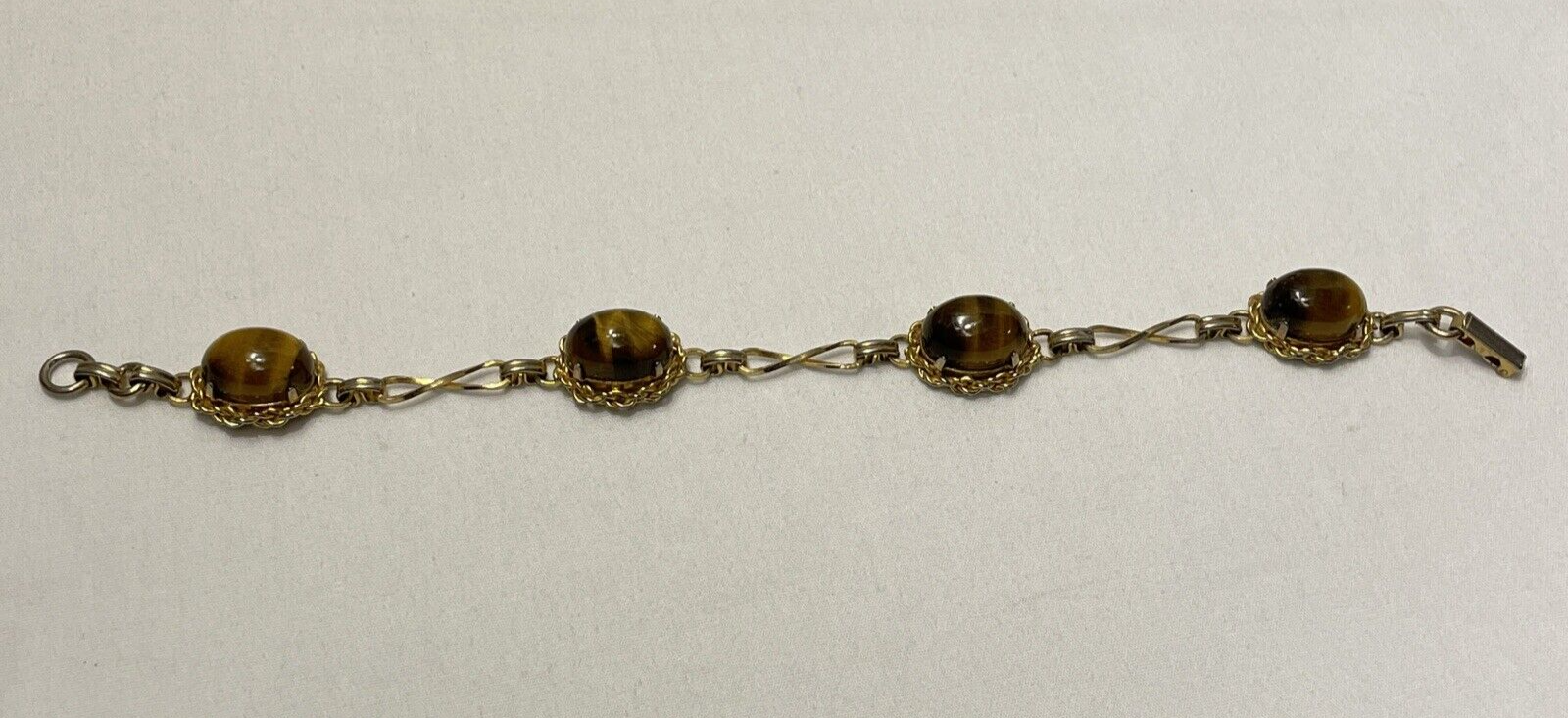 Add a touch of elegance to your outfit with this beautiful gold-filled bracelet. The bracelet features four stunning tiger's eye gemstones, with a fold-over closure for easy wear. Measuring 7.3 inches in length, this bracelet is perfect for any occasion, from birthdays to anniversaries, and is sure to make a statement. Crafted with care, this bracelet is a unique and original piece of jewelry that will make a wonderful addition to your collection. The oval-shaped gemstones are set in a prong style, and the bracelet is made with a 20/2 metal purity. This vintage piece is a true beauty, and it is sure to catch the eye of anyone who sees it. In excellent condition.