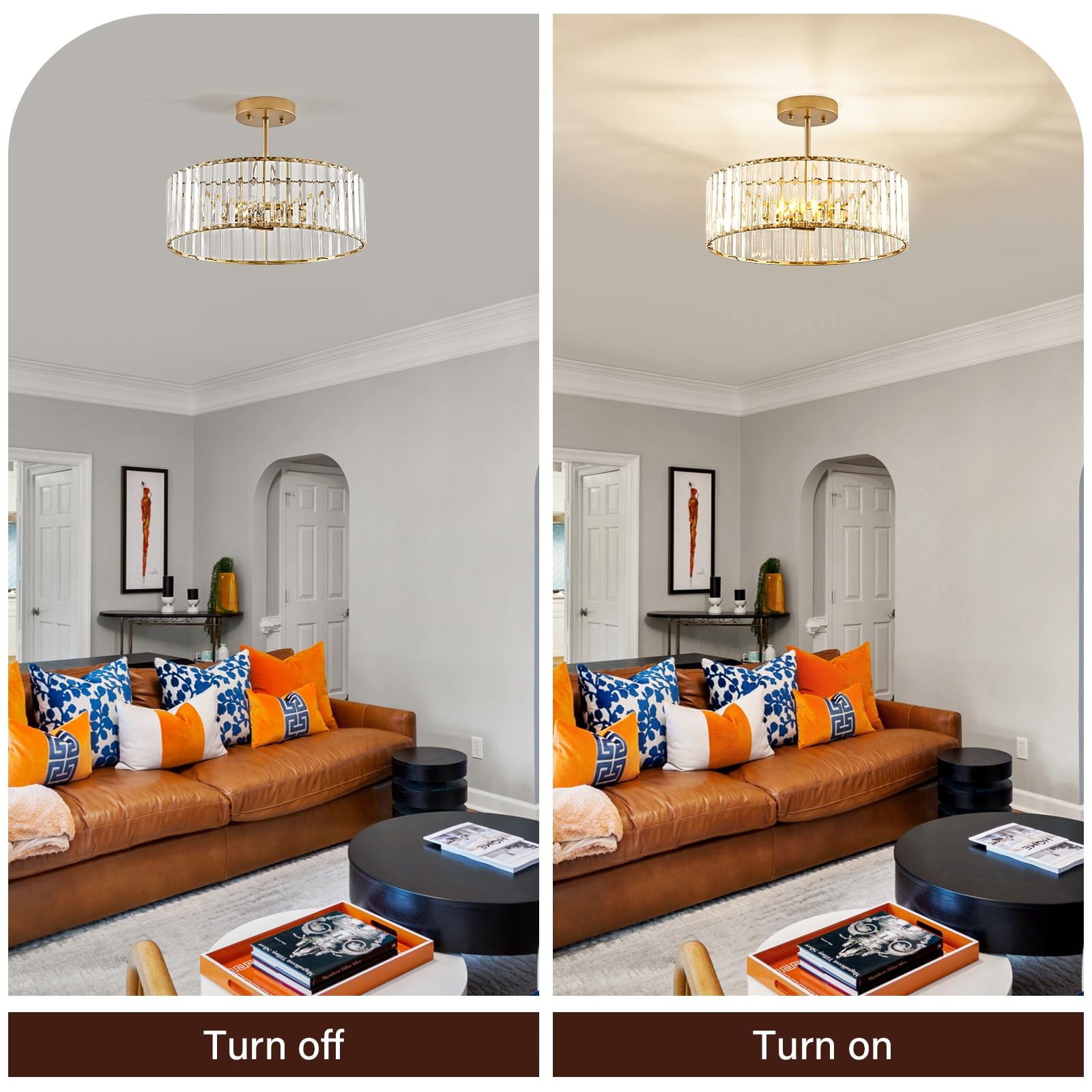 crystal semi flush mount ceiling light crystal semi flush mount crystal flush mount ceiling light crystal ceiling light fixture crystal flush mount light crystal light fixtures ceiling mount Modern Style: Crystal ceiling light features high-quality K9 crystal and a light gold metal frame. When illuminated, it artistically reflects a spectrum of colors throughout the room, creating a warm and elegant ambiance for your home Dimensions: Gold flush mount ceiling light measures 15.8 inch in length, 15.8 inch in width, and 10.8 inch in height, covering an area of 75-135 square feet Compatible Bulbs: Ceiling mount chandelier is compatible with E12 bulbs (up to 60W), including incandescent, LED, CFL, and halogen bulbs. It’s also dimmable when used with a dimmer switch (bulbs and dimmer switch not included) Suitable Spaces: Flush mount ceiling light crystal is perfect for use in kitchens, living rooms, bedrooms, and hallway Easy Installation: All mounting hardware is included in the package, making the installation of this flush mount ceiling light a breeze. With step-by-step instructions, it's perfect for any DIY project. Just remember to turn off the power before starting the installation