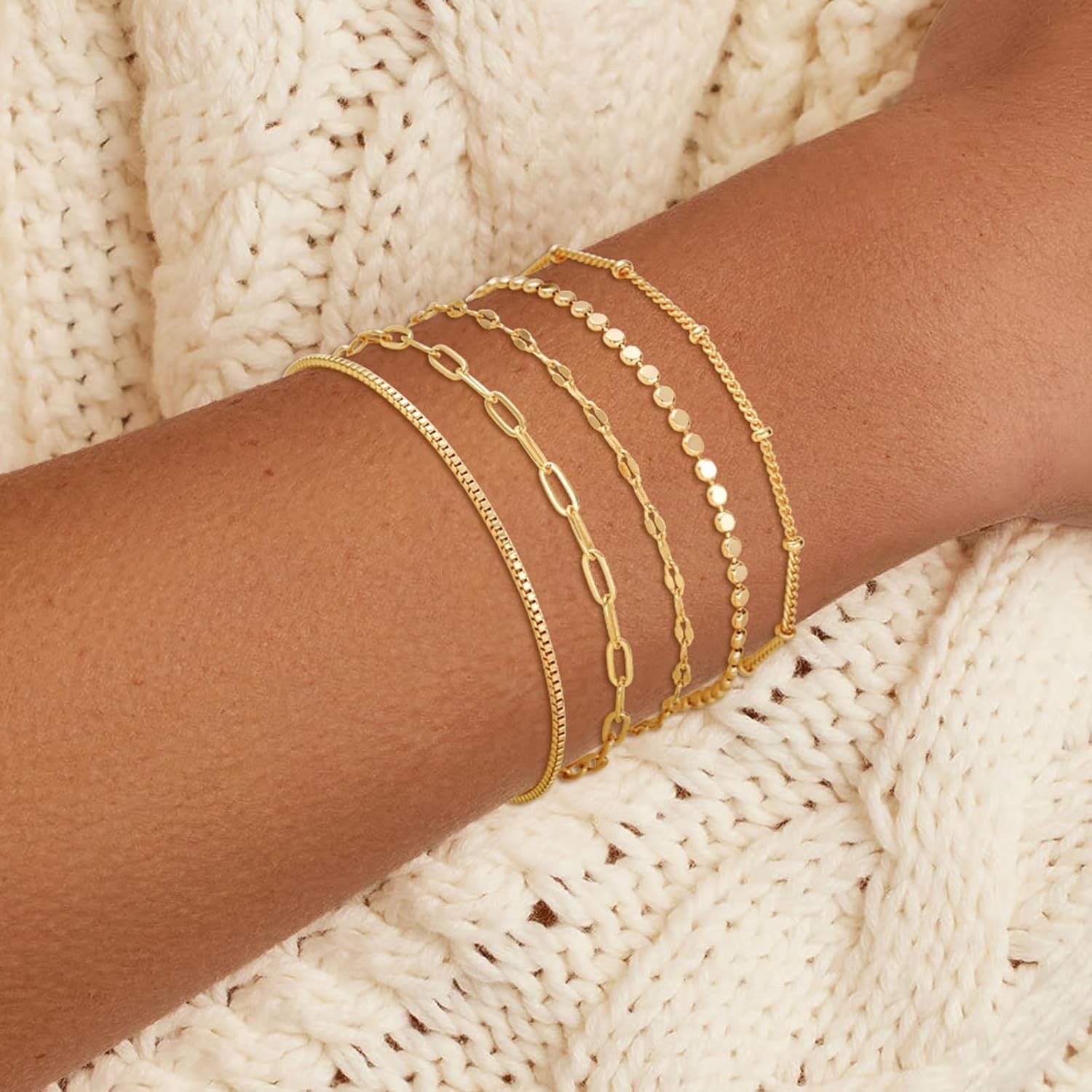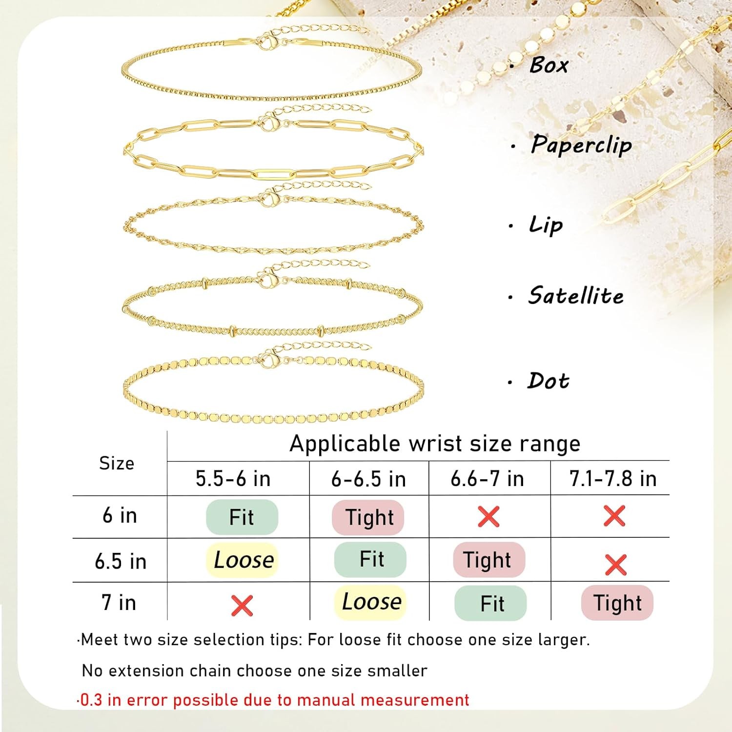 Free eBay listing template designed by dewiso.com Gold Bracelets for Women, Trendy Adjustable 14K Gold Plated Stackable Link Bracelet, Dainty Thin Paperclip Chain Bracelets Stack Set FREE AND FAST SHIPPING! 5 Styles Gold Bracelets for Women: The bracelet set contains box chain/lip chain/satellite chain/paperclip chain/dot chain. Either you can choose to wear them individually or stack them, we believe the bracelets will make the look more sophisticated Flexible Size Adjustment: Chain fits adjustable length: 16.5cm(6.5")+2.5cm(1") extension chain. The chain closure is made of lobster clasp, easy and quick to put on and take off, can be adjusted according to your needs. High Quality: The chain is made of high quality brass materials, 14K gold quality will not fade easily, lead-free and nickel-free, durable, no need to worry about turning green and harming your skin. It can be chosen to be worn in many occasions, such as prom, party, anniversary, homecoming, graduation, birthday or any special occasions, it is an essential fashion item. Applicable Population:This product is designed for people aged 15 and over Product We offer a 30-Day Return Policy on items which you are not completely satisfied with. You have the option for a full-refund or an exchange of the item. No returns are available on items shipped outside of the US . Shipping We offer Free Shipping to the US and ship within 2 business days of payment, usually sooner. We use UPS express shipping. That's why your products are usually delivered within 3 days . Contact We try our very best to make sure every customer is completely satisfied. If there's a problem , message us! We're happy to help. 24/7 live chat available.
