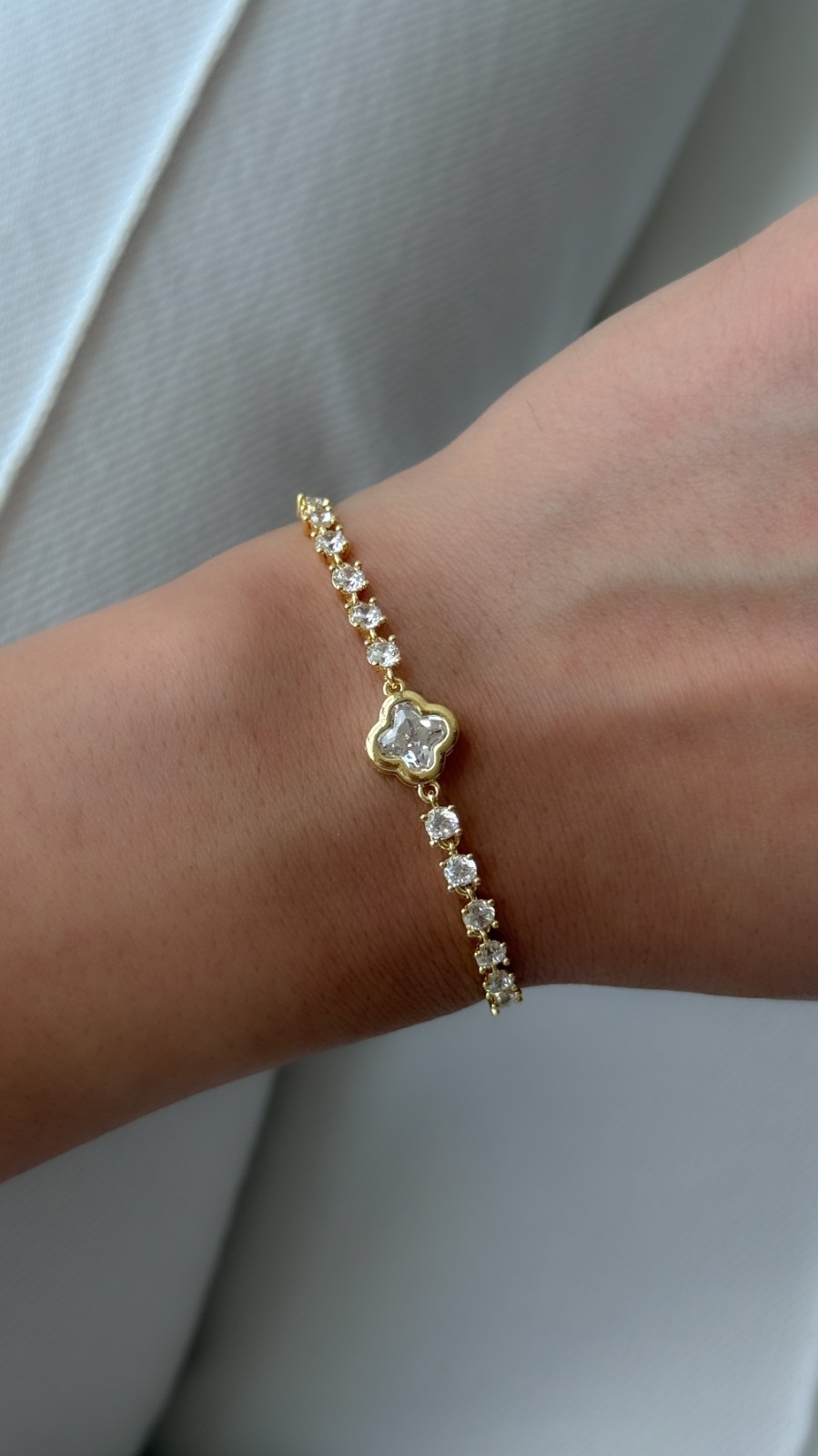 This high-quality, real gold-plated tennis bracelet features a sparkling clover charm and cubic zirconia stones. With its slider clasp, it adjusts easily to fit any wrist. Perfect for everyday wear and special occasions alike, simple, elegant, and gift-ready. * CRAFTED FROM PREMIUM MATERIALS AND FINISHED WITH HIGH-QUALITY GOLD PLATING * BRACELET SIZE: Free size (adjustable). Designed with a slider clasp, this bracelet easily adjusts to fit all wrist sizes, ensuring both comfort and style. .Gold-plated jewelry is hypoallergenic and safe for sensitive skin. .The gold plating won't quickly dull or change color. .It's more durable against water, sweat, and air exposure. .It stays looking new longer, especially with proper care. Have a question? Send me a message anytime!