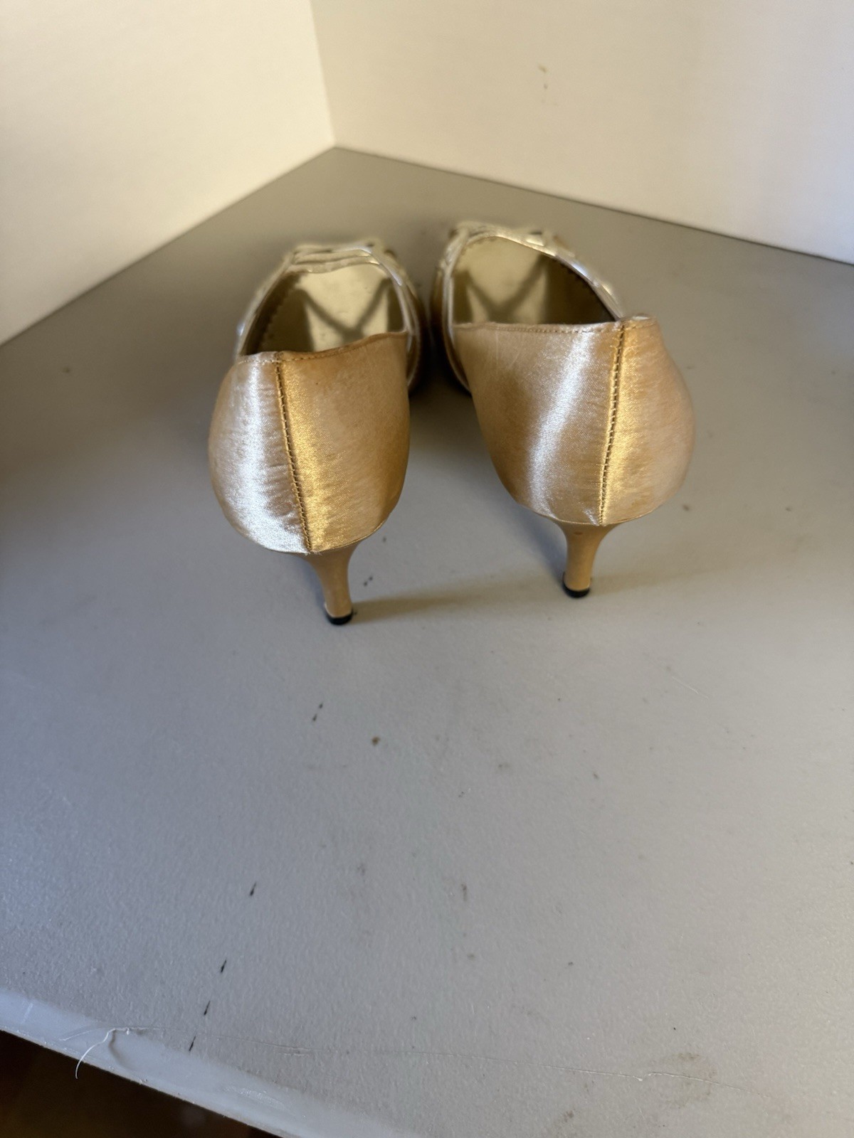 These are a pair of women’s vintage-style peep-toe pumps in a metallic champagne-gold satin with contrasting silver piping and criss-cross strap detailing across the vamp. Key features: • Color: Warm champagne gold (not bright yellow-gold) with silver accents • Material: Satin upper with leather sole (as noted on the insole label) • Toe style: Open/peep toe • Heel: Kitten heel, approximately 2.5 inches (classic low-mid height) • Design details: Scalloped edging along the opening, silver criss-cross straps, subtle shimmer fabric • Size: Marked 9M (US women’s 9, medium width) • Origin: Made in China, style code F3001221, Supplier #1454 • Condition: Very lightly worn — minimal creasing, soles almost pristine, one tiny scuff on one heel tip, satin still has its original sheen. Overall excellent used condition. Style-wise, they have a strong 1940s–1950s Hollywood glamour / swing-dance / pin-up vibe, but the kitten heel keeps them wearable and comfortable for modern use (weddings, dances, themed events, or everyday vintage looks).