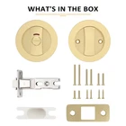 Pocket Door Hardware with Color Indicators High Quality Material: The lock plate is made of high quality zinc alloy material and the lock body is made of stainless steel, which has some weight and texture to better open or close the door. Privacy and Security: The pocket door hardware can only lock via inside which gives enough privacy to your room. When it is in emergency occasion, you can use a metal piece or a coin to unlock it from outside. Size of Round Pocket Lock: Diameter of lock plate: 2.6 inch. Fit for standard door thickness from 1.2 inch to 2 inch. The pocket door handles are suitable for bedroom, bathroom, kitchen and other rooms. Accessories: You will get 1 pack gold pocket door hardware which includes the lock necessary component and 1 Installation Instruction. Please install the lock based on the steps on instruction and be free to contact us if you have any inquires. Long term use: pocket door lock with Color Coded Indicator is a good choice for long term use for its quality and classic outlook. The indicator clearly shown the room is space or occupied.