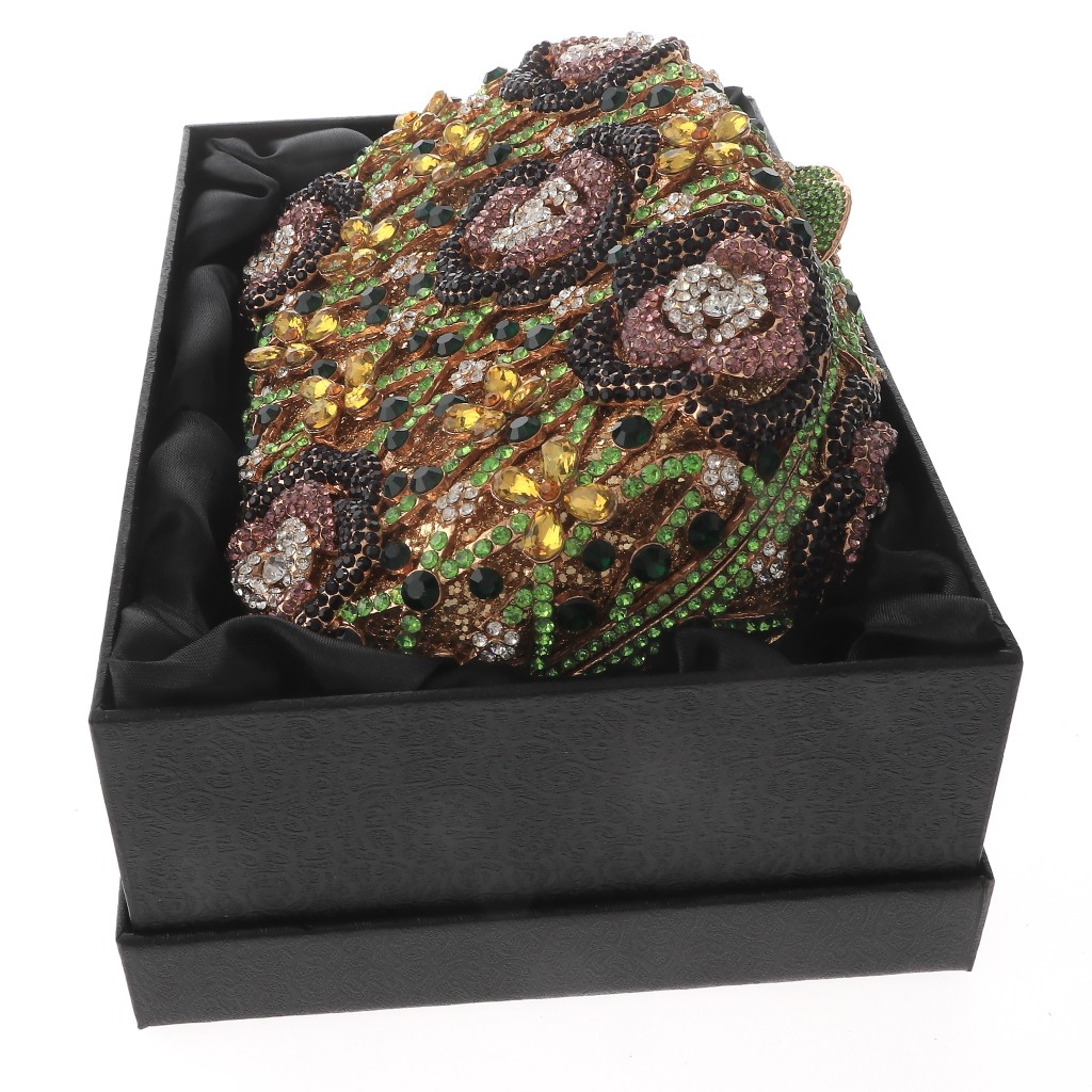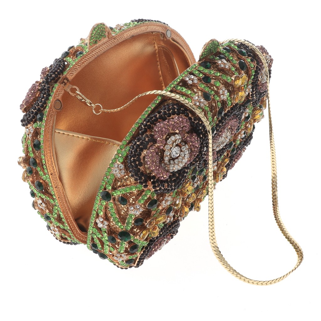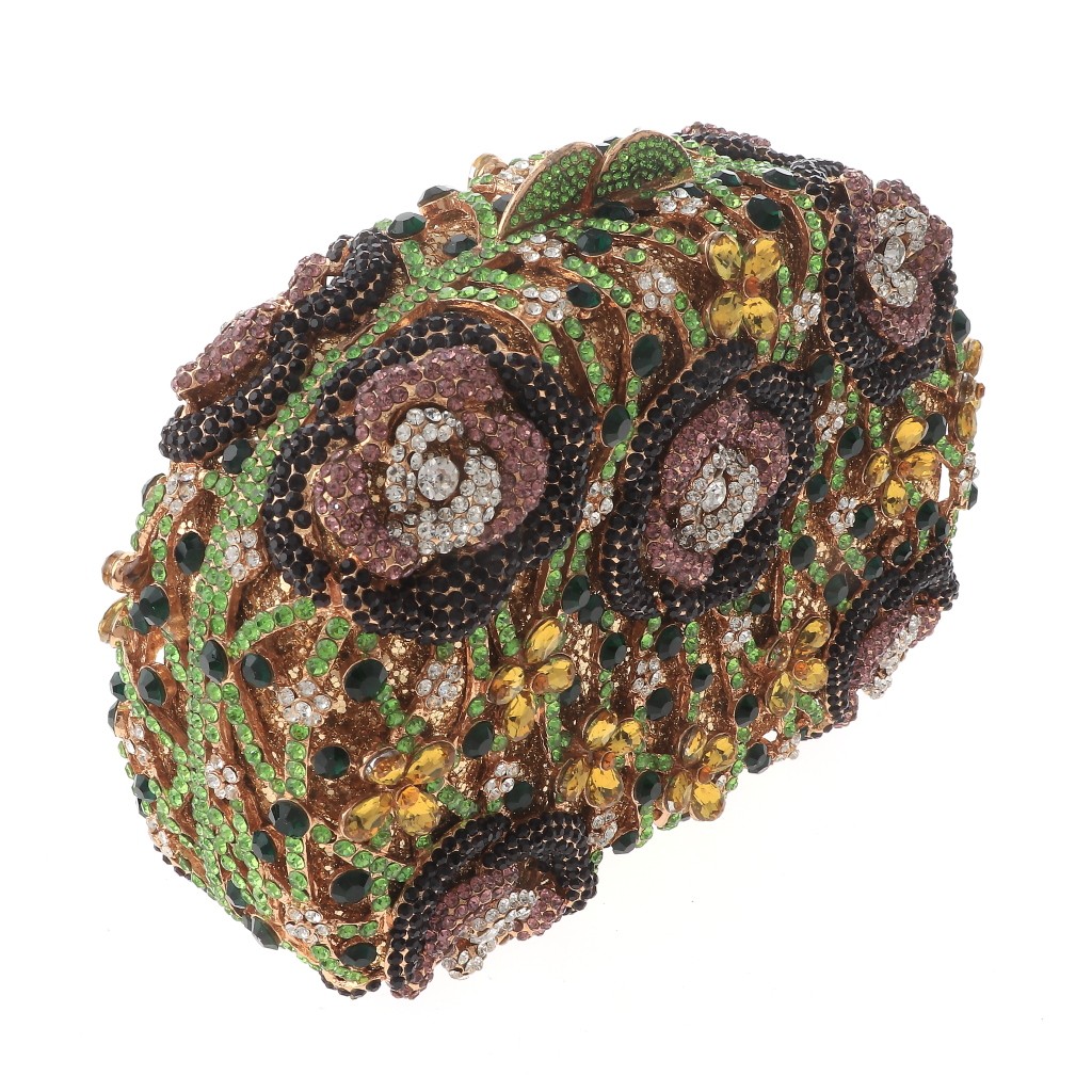 Gold Tone Metal Rhinestone Crystal Clutch Evening Bag / Approximate Size: 7.5" L x 5.5" W x 3" D / 20" Long Chain Included / Color: Gold & Green, Purple Condition: Brand New SKU: HB6139-GNP Color: Purple Design: Flowers & Plants All orders will ship from USA via UPS or USPS. We expect all local orders will receive the items within 7 business days or less depend the location. Worry free international shipment delay or custom duty fee.