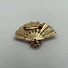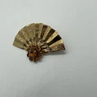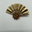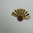 Elevate your jewelry collection with this exquisite Gold Tone/Etched Fan Victorian Brooch adorned with Rust Color Sparkle Stones. This vintage piece is a must-have for any brooch lover. The intricate etching and beautiful stones make this brooch a perfect accessory for any occasion. Crafted with high-quality materials, this brooch features a gold tone metal and stone material that exudes elegance and sophistication. The rustic color of the stones adds a touch of charm to the overall design. Its unique shape and style make it a perfect addition to any jewelry collection.