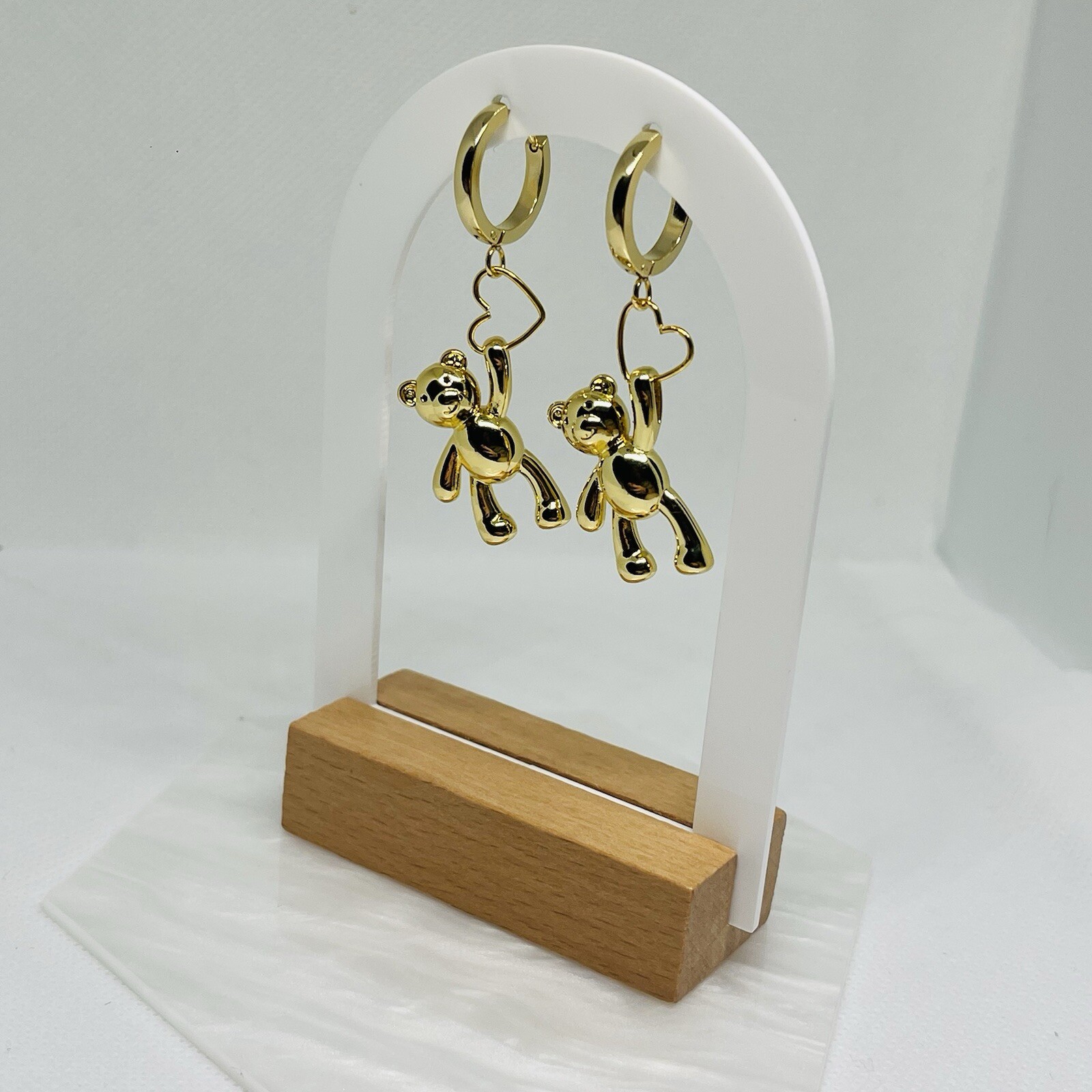 These 18k Gold plated hoop earrings with a dangling teddy bear heart charm are a playful and charming accessory. The earrings feature a classic, polished gold hoop design, which serves as a subtle and elegant base. Hanging from each hoop is a small, adorable teddy bear charm, crafted with attention to detail. The teddy bear holds a heart, adding a sweet and whimsical touch. The combination of the warm gold and the playful charm gives the earrings a youthful, yet refined look, making them a fun and unique piece of jewelry suitable for both casual and dressy occasions. #GoldHoopEarrings #TeddyBearCharm #HeartCharm #CuteEarrings #PlayfulJewelry #SweetStyle #WhimsicalAccessories #GoldJewelry #AdorableEarrings #FashionDetails #CharmJewelry