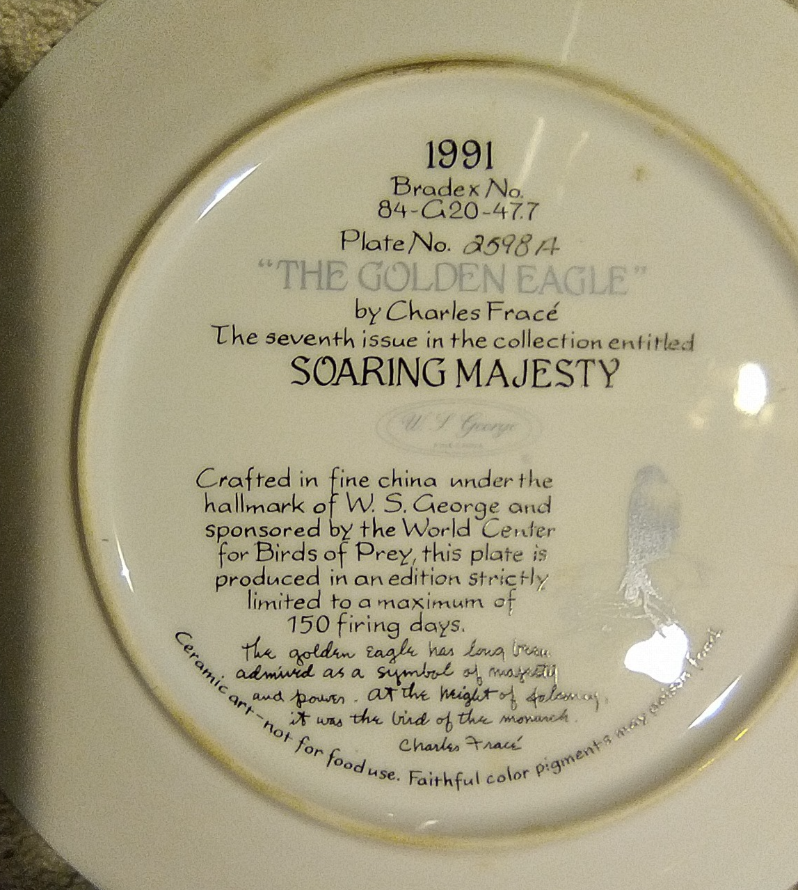 $ 5.19Bradford Exchange Peregrine Falcon Soaring Majesty Plate by Charles Frace 1991