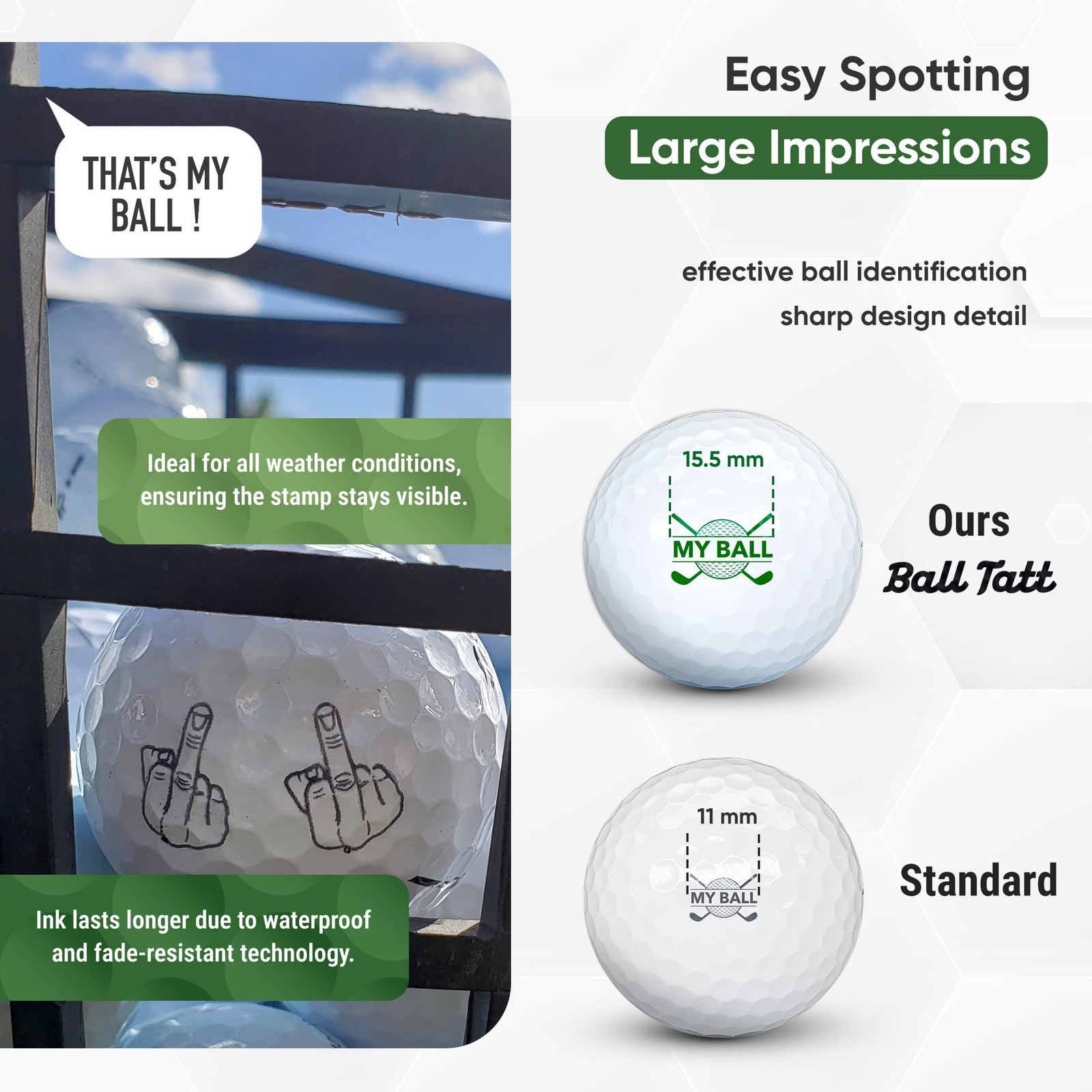 - Finger Golf Ball Stamp, Golf Ball Stamper, Self-Inking Golf Ball Stamp Markers, Reusable Golf Ball Marking Tool to Identify Golf Balls, Golfer Gift Golfing Accessories… BIGGER, WIDER, EASIER TO SPOT: Up to 50% larger & easier to recognize than most golf ball stamps! 0.75'' x 0.5'' golf ball stamper pad imprints BIG permanent impressions for fast & easy ball identification. SELF-INKING, NO MESS, NO FUSS: Our golf ball marker stamps are pre-loaded with enough ink to last the season & don’t ever need to be refilled or fussed with. No spills. No leaks. Use at home or at the course. QUICK-DRYING PERMANENT INK: Stamp golf balls & swing in seconds! Fast-drying, waterproof & fade resistant, our quick dry stamping ink is less prone to smudging & made to outlast the life of your golf ball. LOTS OF UNIQUE STAMP MOTIFS: stampers come in a wide range of creative designs and styles, you'll be sure to find one that fits you to a tee! GREAT GIFT IDEAS FOR GOLFERS: Self-inking golf ball markers are top golf gifts on every golfer’s wish list. The perfect golf gift for the golfer in your life. PORTABLE FOR CONVENIENCE More convenient than golf ball engraving, golf ball tats can be applied on or off the course. Unlike a golf ball engraver, self inking golf ball stampers allow you to quickly mark balls on the go. Customize golf balls in a JIFFY! No delay whatsoever. Stamp & tee off right away. Fast-dry ink for the win. NO INK LEAKS OR REFILLING Carrying a leaky ink bottle for refills just isn't practical. Which is why we've made DIY golf ball stamps self-inking. Preloaded to deliver even applications for optimal precision, self-inking golf ball stamps couldn't be easier to use. Outfitted with airtight caps to prevent drying, they're foolproof. UNIQUE DESIGNS IN 4 COLORS Choose from a wide variety of unique mottos, funny sayings, trendy symbols & more in blue, black, green or red. golf ball stamper markers are available in a range of humorous, patriotic, quirky, eccentric & distinctive styles. Never again confuse your balls for another's. Find & spot golf balls like a hawk. Weekend golfers & professional linksmen alike count on to personalize golf balls. The long lasting high performance golf ball stamps you can trust, our golf ball stamper markers make excellent golfing gifts for men & women golfers. Give stamps as golfer stocking stuffers, golfing retirement gifts & more. Shipping We offer FREE shipping on all orders! We ship within Three business days of payment, usually sooner. We use a selection of shipping services such as UPS, FedEx, USPS etc. We only ship to the lower 48 states, no APO/FPO addresses or PO Boxes allowed. Local pickups and combined shipping options are not provided at this time. Return You can return a product for up to 30 days from the date you purchased it. Any product you return must be in the same condition you received it and in the original packaging. Please keep the receipt. Payment We accept payment by any of the following methods: PayPal Please pay as soon as possible after winning an auction, as that will allow us to post your item to you sooner! Feedback Customer satisfaction is very important to us. If you have any problem with your order, please contact us and we will do our best to make you satisfied. Contact Us If you have any queries, please contact us via ebay. We usually respond within 24 hours on weekdays. Please visit our eBay store to check out other items for sale! Thank you for shopping at our store.