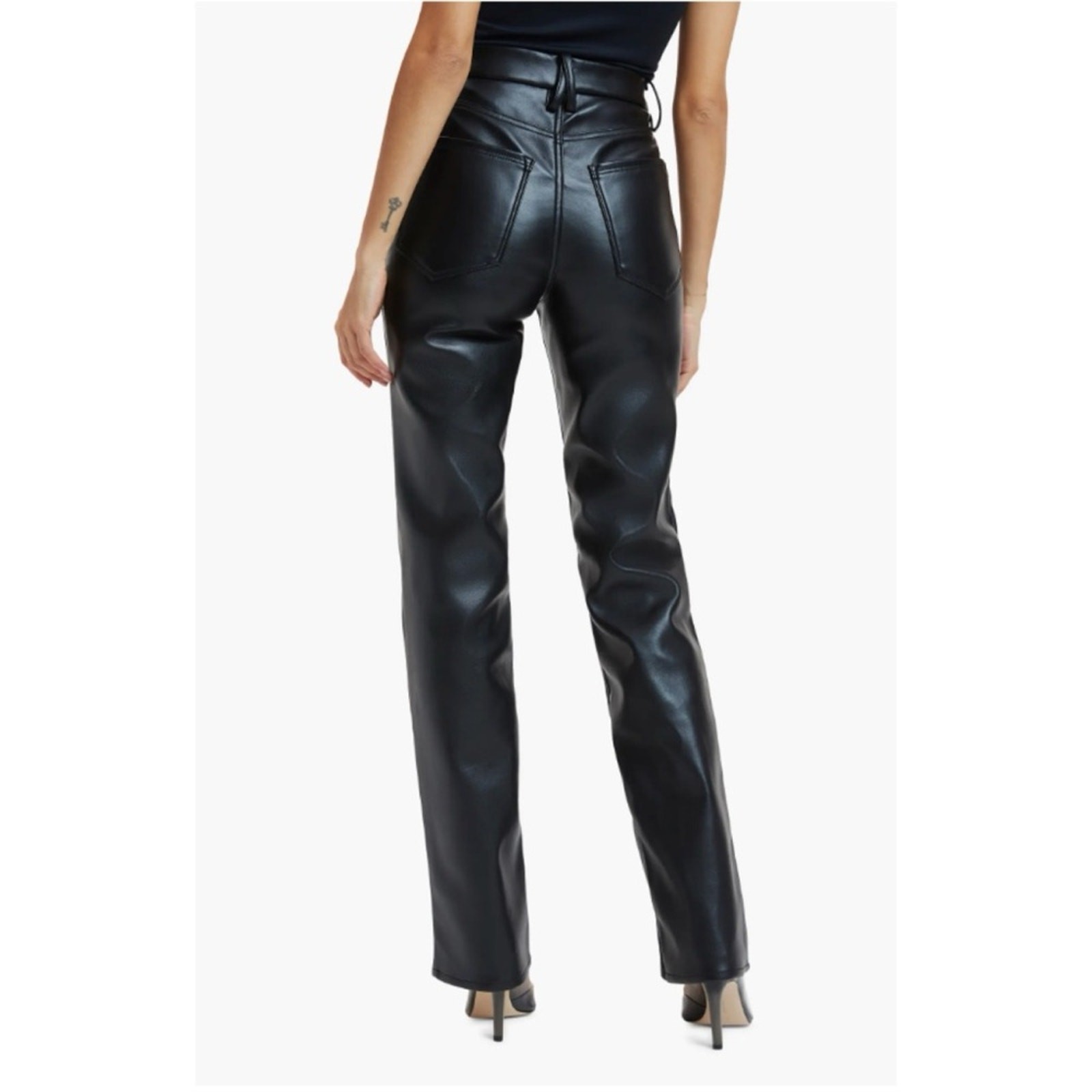 Good American Better Than Leather Faux Leather Good Icon Pants Womens Size 10 This item is in great preowned condition, cute, trendy. One small flaw pictured. Faux leather, high waisted. A glossy, smooth faux-leather finish elevates these straight-leg pants cut in a flawless silhouette that compliments every body type. Women's Size 10 Approx Measurements: Rise: 11.5 in Inseam: 32.5 in