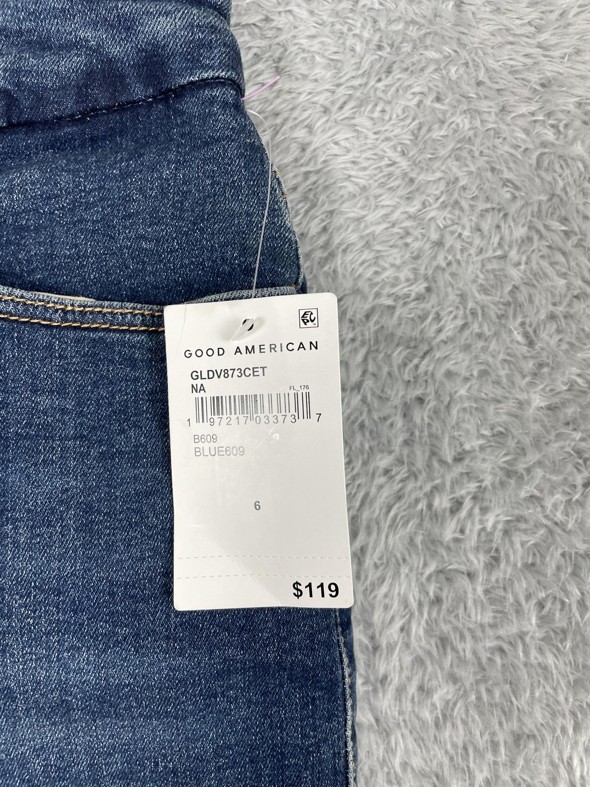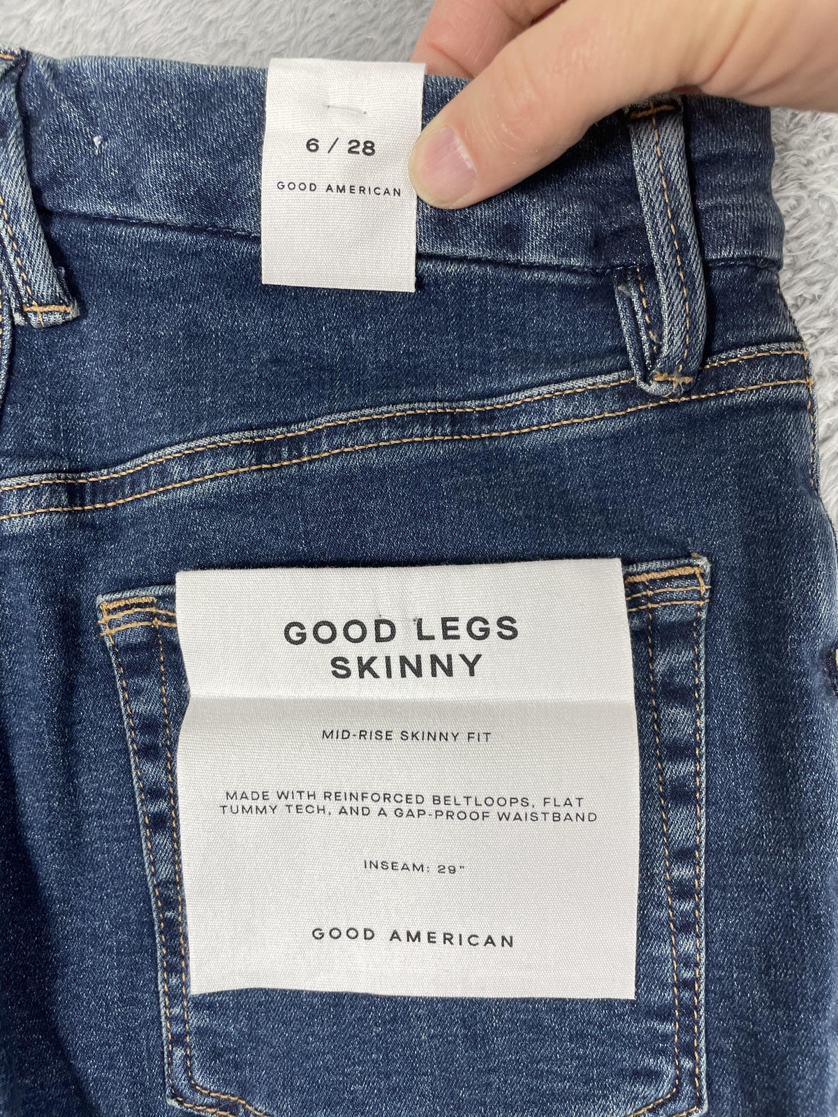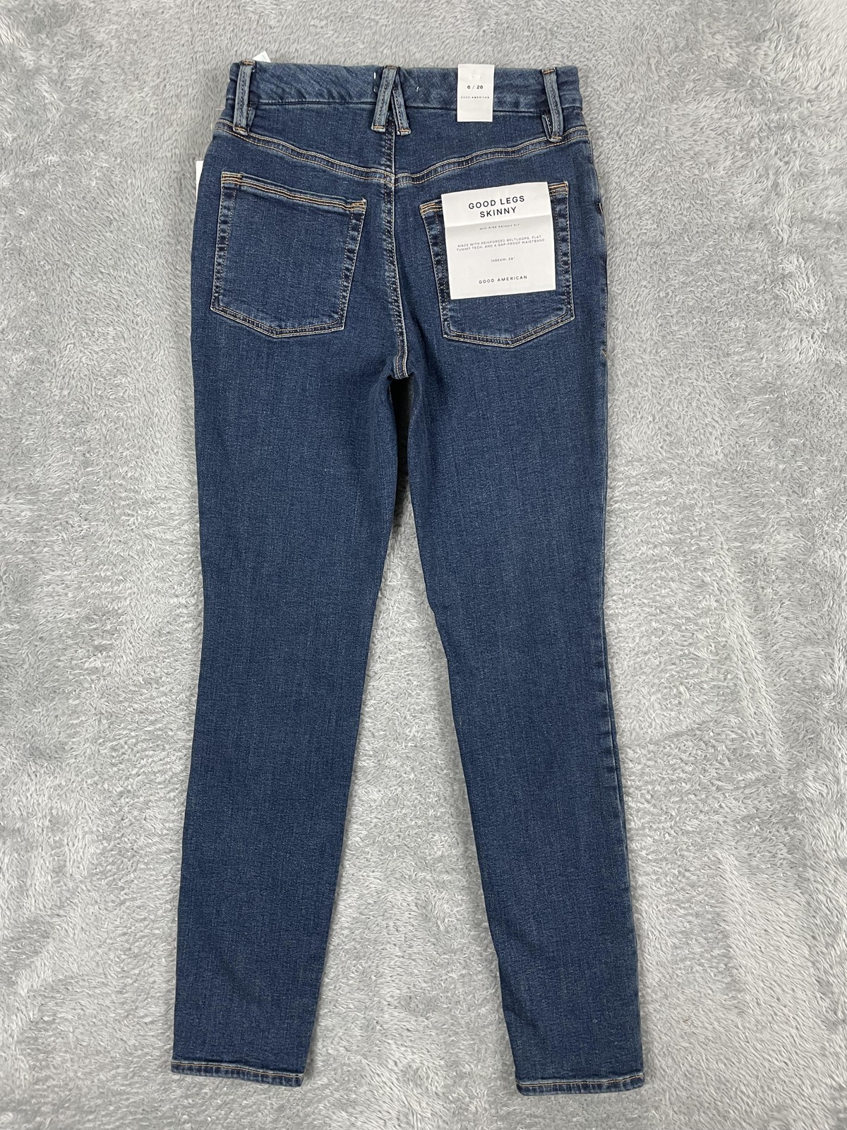 Brand: Good American Style: Womens Good Legs Skinny mid-rise skinny jeans in a medium blue wash stretch denim. Department: Women; Size on tag: 6/28. Color: Medium blue wash; Pattern: Solid with subtle fading at the front thighs and back for a softly worn-in look. Material: 98.5% organic cotton, 1.5% elastane stretch denim; made in Egypt. Closure: Zip fly with button closure at the waist and belt loops around the waistband. Details: Classic five-pocket styling with front scoop pockets, coin pocket, and back patch pockets; contrast stitching and silver-tone hardware; designed with reinforced belt loops, flat tummy tech paneling, and a gap-proof waistband for a smoothing, contoured fit. Fit: Mid-rise skinny fit that sits between the natural waist and hips, slim through the hip and thigh with a narrow leg opening. Style/Model information: Inner waistband label reads GOOD AMERICAN size 6/28; inner care tag lists RN 151301 and style GLDV873CET GOOD LEGS BLUE609; back-pocket info card reads Good Legs Skinny mid-rise skinny fit made with reinforced beltloops, flat tummy tech, and a gap-proof waistband with inseam 29. Actual Measurements: Inseam: 29 in. UPC: 197217033737.