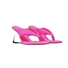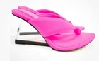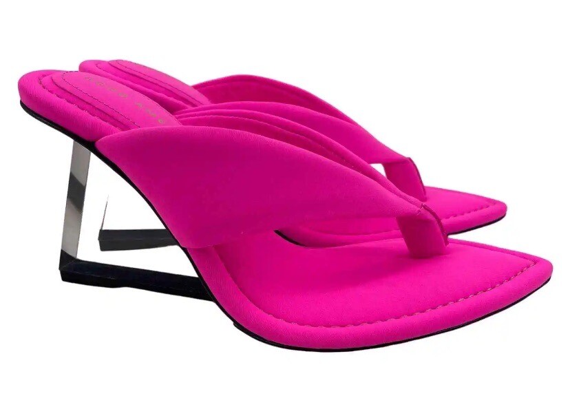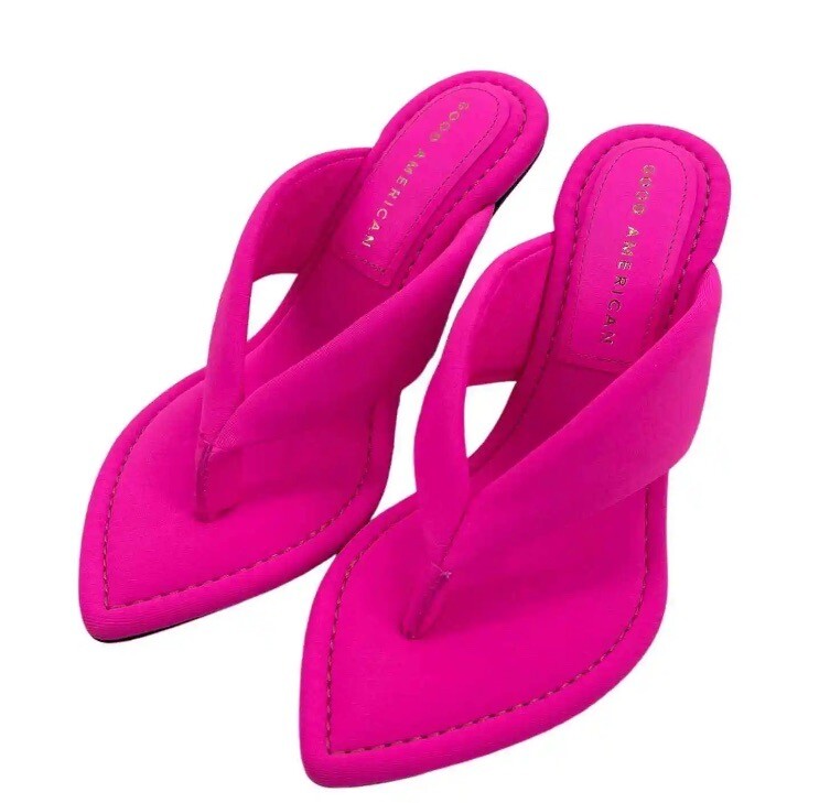 Step up your shoe game with these vibrant neon pink wedge sandals from Good American. The slip-on style with a thong design is perfect for a day out, while the high wedge heel adds a touch of glamour to your outfit. The sandals feature a solid pattern and a clear wedge heel, making them a unique addition to your shoe collection. The Good American sandals come in UK shoe size 7.5, US shoe size 7.5, and EU shoe size 37.5. The neoprene upper material combined with cushioned and breathable features offer comfort, making them great for long walks. These sandals are perfect for any Barbie fan out there, with character accents that will make you feel like Cinderella. Get ready to turn heads with these stylish wedge sandals. The only signs of wear are the scratches on the bottom other than that they look new