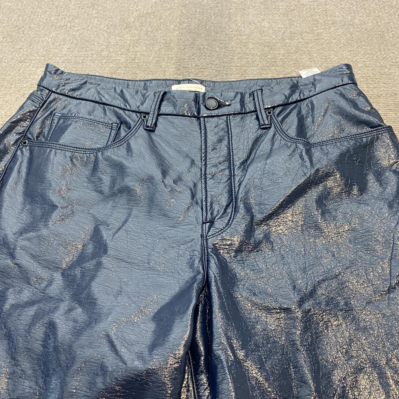Pants are in very good condition. Measurements are shown in the last few photos, feel free to ask any questions. Brand: Good American Item: Womens faux leather pants in a glossy blue finish with a jeans-style design. Color: Blue with a subtle metallic sheen and crinkled faux-leather texture. Size on tag: 12 / 31 Style/Model code (per inner tag): GNV464, TWI-LIGHT01 Materials: Faux leather shell 100% polyurethane; backing/support 100% viscose. Design details: Five-pocket style with front hand pockets and coin pocket, rear patch pockets, zip fly with button closure, belt loops at waistband, straight leg silhouette, likely mid to high rise based on measurements shown. Made in China (of imported fabrics and trim).