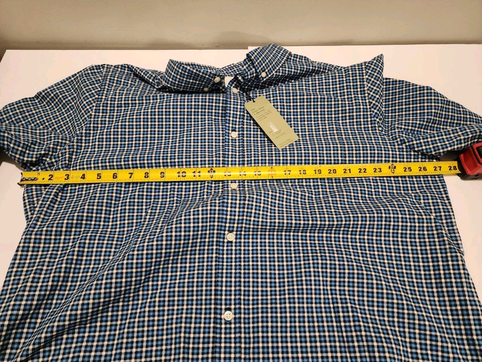 This is a NWOT Goodfellow & Co button-up shirt in size 2XL with long sleeves in a slim fit. The shirt is made of a cotton blend material in a blue color. It features a collared neckline with a button-down collar style. The shirt is designed to have a slimming effect and is suitable for casual wear.