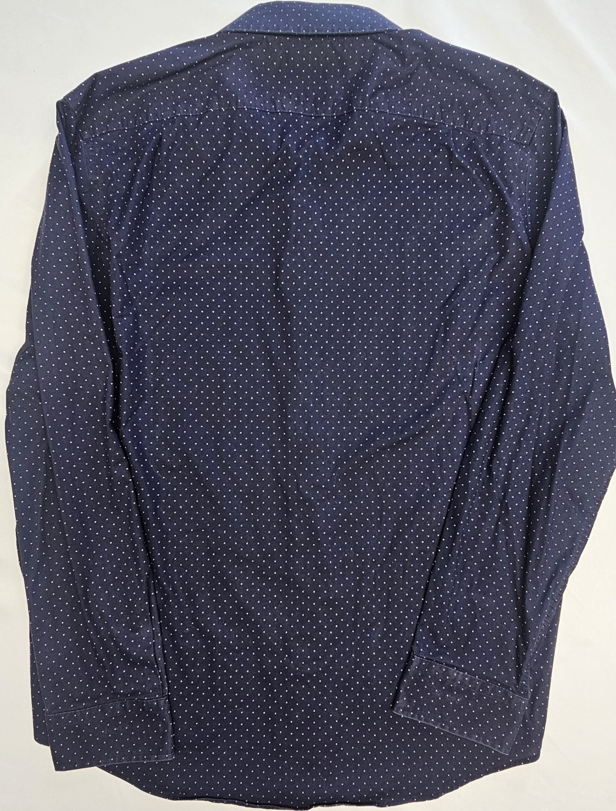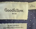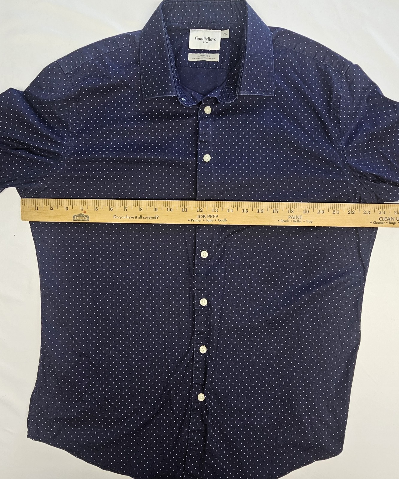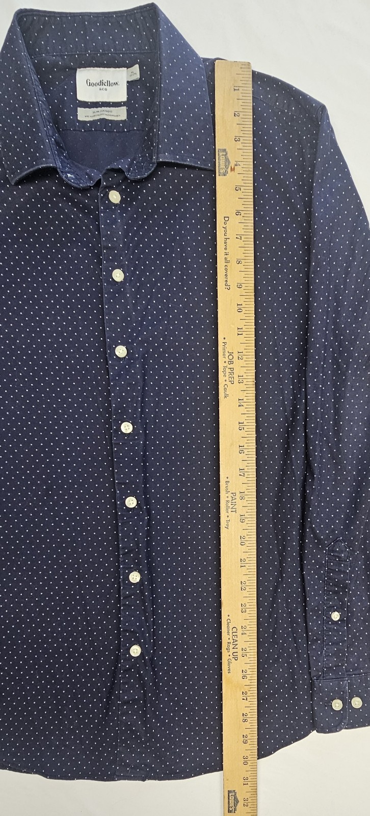 Elevate your style with this slimming Goodfellow & Co button-up shirt. Perfect for any occasion, this polka dot shirt features a spread collar, long sleeves, and a button closure. Made of a cotton-spandex blend, this denim shirt is machine washable for easy care. This shirt is perfect for travel, weddings, parties, casual outings, formal events, workwear, and business meetings. With a chest size of 48 inches, this XL shirt is designed to fit regular size men. The slim fit design is flattering for any body type and the shirt is available in a beautiful blue color.