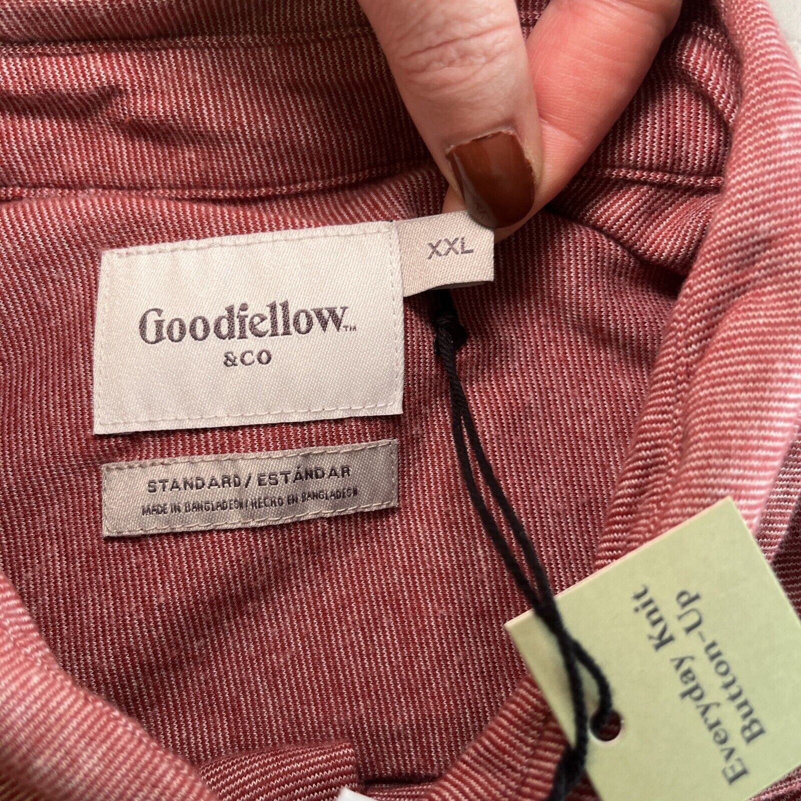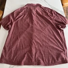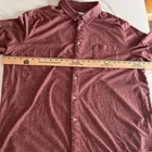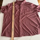 This is a Goodfellow men's button-up shirt in size XXL. It features a striped pattern, collared neckline, short sleeves, and button closure. Made of cotton knit fabric with a comfortable stretch, suitable for various occasions like travel, parties, casual or business settings. The red maroon shirt has a standard fit and is machine washable. New with tags. See photos for measurements.