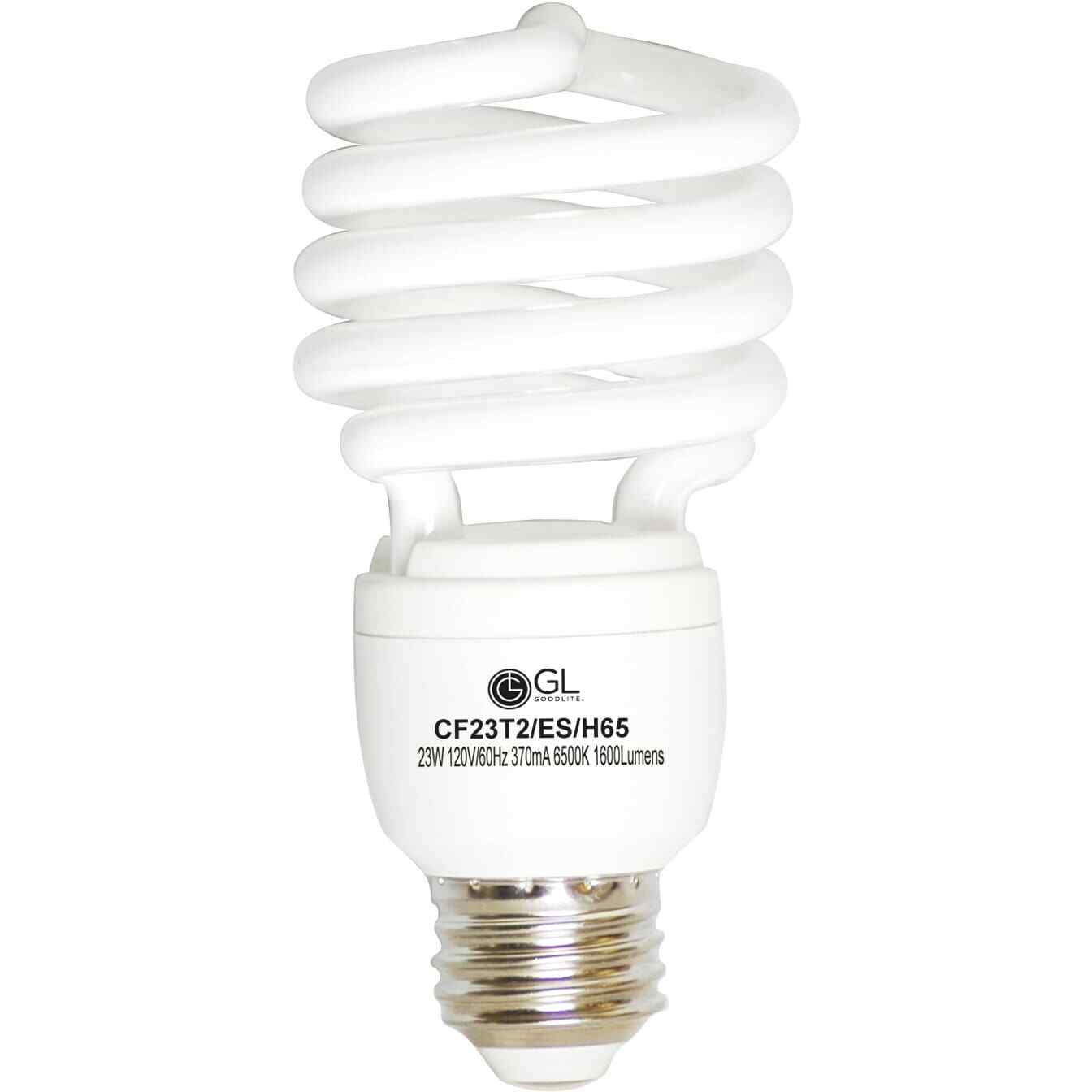 This compact florescent light bulb offers long life and quality energy efficient task lighting in a broad range of colors and sizes to fit any decor. Bring the outdoors in with a bright white light similar to natural outdoor light for any room in the home, Goodlite line of CFL can meet your needs. Most fluorescent bulbs are straight (linear) but some fixtures use circular (Circline) bulbs, while other fixtures use a U-shaped (U-bent) design. Connector type: Standard E26 baseRated voltage: 120Output power: 23WInitial lumens: 1600Lifetime: Over 10,000 hours Bulb color: Super whiteBulb size: 4.65 inches high x 2 inches wideColor Temperature: 5000KModel: CF23T2/ES/H50 Free Shipping Over $49.99* Details Goodlite 23-Watt CFL 100 Watt Replacement 1600-Lumen T2 Spiral Super White Light Product Description: This compact florescent light bulb offers long life and quality energy efficient task lighting in a broad range of colors and sizes to fit any decor. Bring the outdoors in with a bright white light similar to natural outdoor light for any room in the home, Goodlite line of CFL can meet your needs. Most fluorescent bulbs are straight (linear) but some fixtures use circular (Circline) bulbs, while other fixtures use a U-shaped (U-bent) design. Connector typeStandard E26 base Rated voltage120 Output power23W Initial lumens1600 LifetimeOver 10,000 hours Bulb colorSuper white Bulb size4.65 inches high x 2 inches wide Color Temperature5000K ModelCF23T2/ES/H50