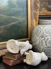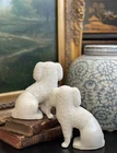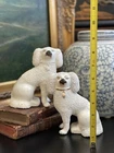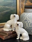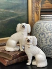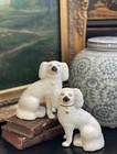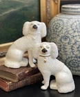 Magnificent Rare 19C White English Staffordshire Figural Spaniel Mantle Dog Pair • Textural Coats • Rare Style with Separate Legs • Heavy Period Model • Embossed Mark to Bases 2 1/2 • Gallery Quality • Height 5.6” This is a stunning pair of extremely scarce gallery quality 19C English Staffordshire mantle dogs featuring textural coats in classic form and rarely found in this petite but rarely seen robust scale. Beautifully modelled with intact separate front legs and highly desirable for their timeless style, this superb surviving period pair of right and left facing figures will bring a touch of the English countryside to any setting in which it is placed when paired on its own or featured as part of a collection or arrangement. Excellent rare period examples to own and treasure. Condition of this superior find is excellent with minimal expected age related wear only. Superbly aged patina on these pristine display ready figures. No post production chips or cracks. Extremely high quality pair. * Listing is for white textural mantle dog pair only. Other objects are for display purposes. Height 5.6” Length 4.6” Width 3.25”
