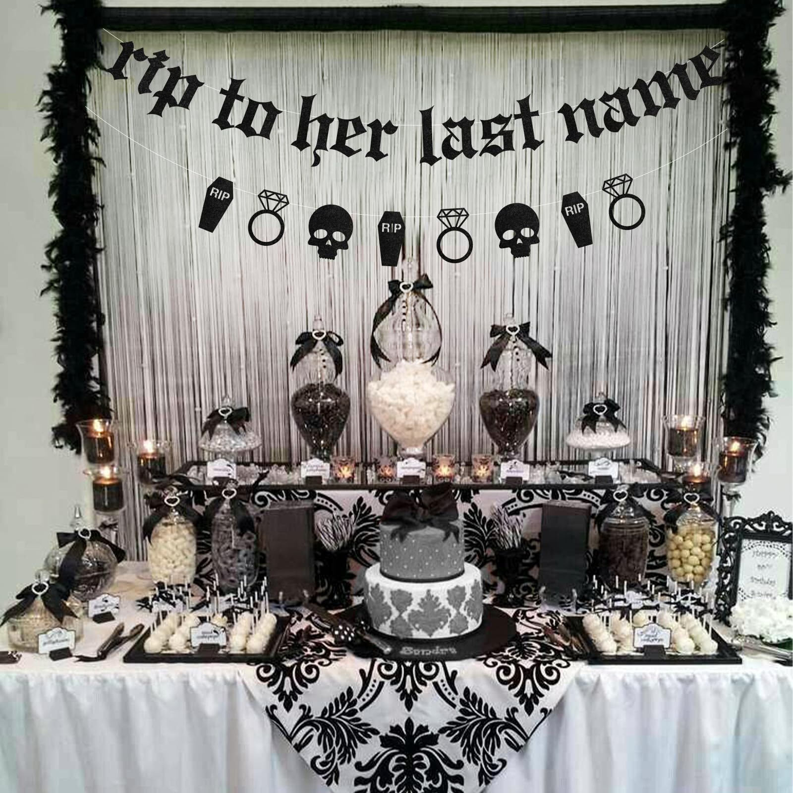 Sursurprise Gothic Bachelorette Party Decorations, Rip to Her Last Name Banner, Old English Emo Bridal Shower Engagement Wedding Party Supplies Gothic Engagement Party Decorations, Rip to Her Last Name Banner Sign Black Gothic Garland, Old English Emo Halloween Bachelorette Bridal Shower Wedding Decor Package Includes: 1pc rip to her last name banner and 1pc Gothic themed garland. Material: Gothic bachelorette party banner kit is made of black glitter cardstock, sturdy and durable. It is eye-catching to hang it on the wall, door, windows, table, mantel, fireplace or other places. Easy To Use: Gothic engagement party decorations are assembly required, it’s easy to thread through punched banners with included pin and ribbon and adjust the spacing. Occasions: Rip to her last name decorations are perfect for Gothic bachelorette party, bridal shower, wedding party, engagement party, Old English party, emo party, Halloween bachelorette party, etc. Gothic Design: Rip to her last name sign in Gothic black letter design will be a wonderful photo backdrop for you and your family and friends. Shipping from the USA All of our products are shipped from the USA, ensuring quick delivery to your destination. Payment We offer the following payment methods: PayPal, credit card, bank transfer, and eBay's secure payment system. Free Shipping & Free Returns Shipping within the USA is FREE. Additionally, any return is absolutely free for you. Risk-Free Purchase You have the option to return an item within 30 days without any justification. We cover the return shipping costs! Fast Shipping We ship immediately upon receipt of payment. Generally, the package is delivered within 2-3 days in the USA. If it takes longer, we will contact you. Quality and Costs Made in Europe, USA, China No customs fees or additional charges Total satisfaction guarantee Invoice with declared VAT available upon request in .pdf format Feedback Your feedback is very important to us. After you pay for your purchase, you will automatically receive positive feedback from us.
