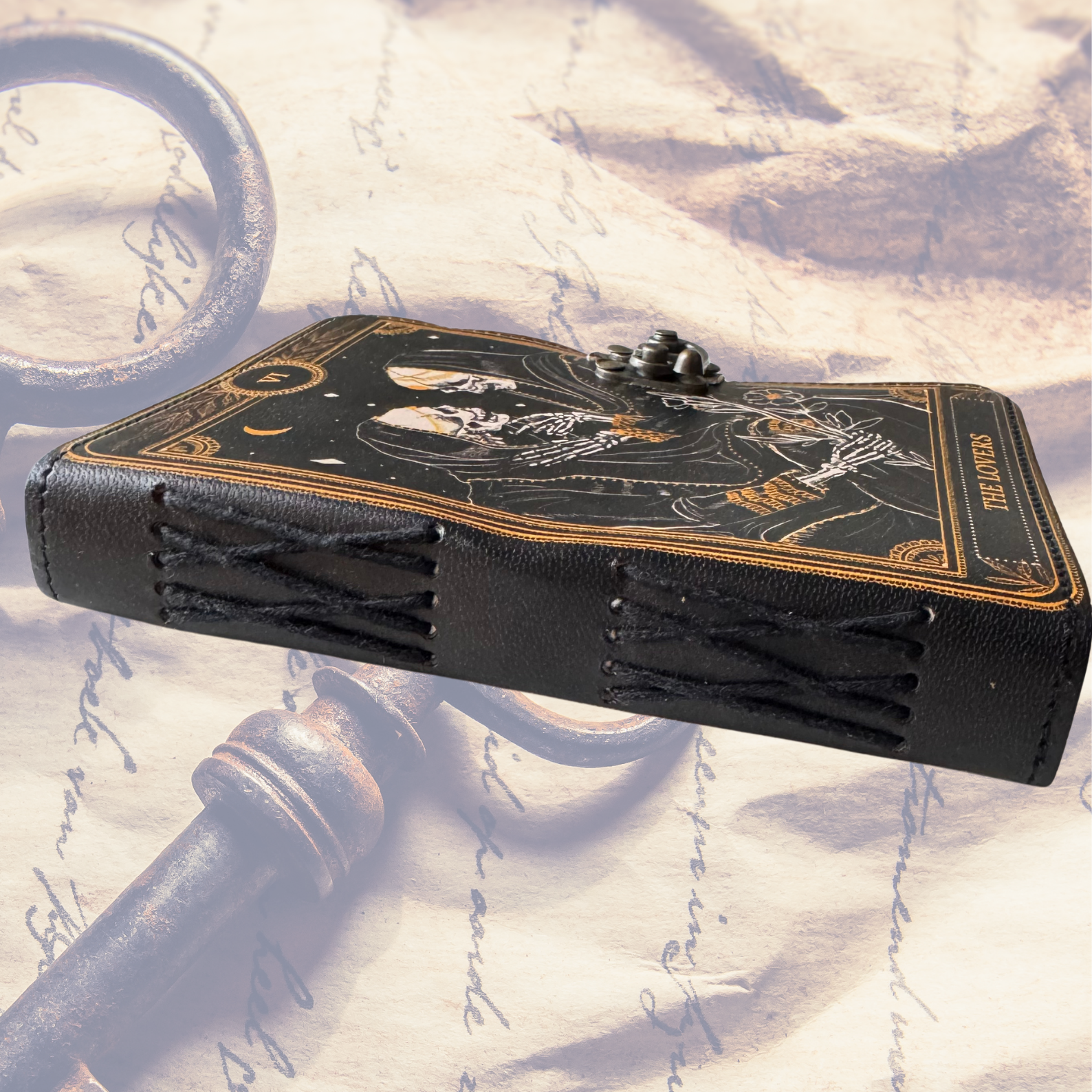 The Lovers Tarot Notebook – A Mystical Leather Grimoire Step into the realm of magic and mystery with The Lovers Tarot Notebook, an exquisite Leather Gothic Book of Spells designed for those who embrace the mystical and the macabre. Whether you're a devoted practitioner of the occult, a tarot enthusiast, or someone who appreciates dark and antique aesthetics, this Grimoire Printed Journal Notebook is your perfect companion. 📖 Features: Premium Leather Cover with a beautifully printed Lovers Tarot Card design, symbolizing destiny, duality, and deep connections. Aged antique-style pages that capture the essence of ancient spellbooks and secret grimoires. Compact yet spacious, making it ideal for spellwork, dream journaling, tarot readings, or personal musings. Gothic and mystical aesthetics, perfect for fans of Skull Lover artwork and vintage book collectors. Use it as a personal grimoire, a diary for your moon rituals, a spell journal, or an artistic notebook for your gothic poetry. This antique journal is more than just a notebook—it’s a portal to your thoughts, spells, and spiritual journey. 🎁 A Unique Gift for Gothic & Witchy Souls Looking for a mystical and meaningful gift? This Lovers Tarot Notebook makes a perfect choice for witches, tarot readers, gothic writers, and antique journal lovers. ✨ Let the magic of The Lovers guide your journey—order yours today! ✨ Ships from Melbourne within 1-2 business days via tracked postage.