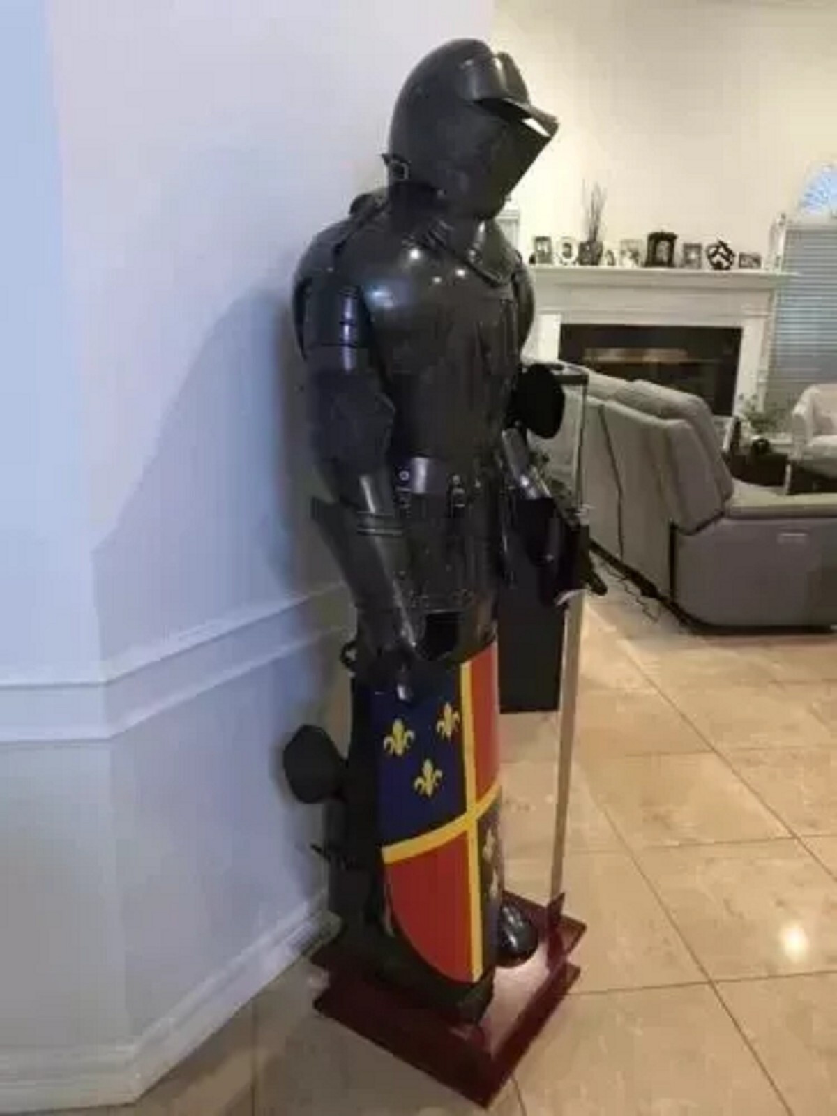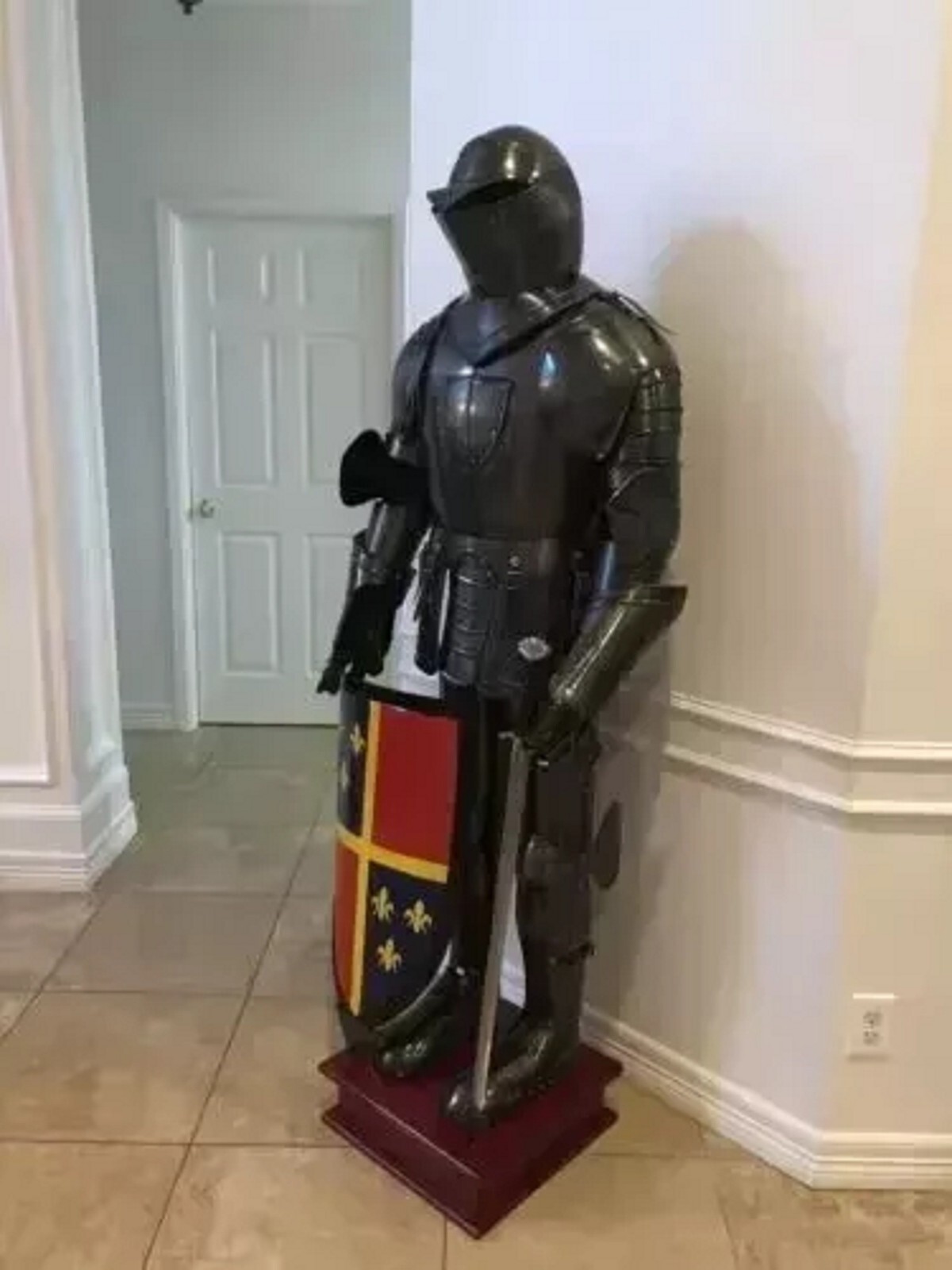 Medieval Knight Wearable Suit Of Armor Crusader Full Body Armour Suit Free Black Base & Iron Stand Shield and Sword Is Included With The Armor Light Weight Armor & Its fully wearable and comfortably made. Premium quality well made Medieval Knight Suit Of Armor Size : XL Men's Metal : Steel - 20 Gauge Finish: As shown in Picture Full Size reproduction Handcrafted : Steel and Iron construction Weight with wooden base and stand: 25 kg (approx.) Made of high quality Steel & Iron 20 Gauge High Splendid Finishing. Best leather gloves inside. High quality leather straps. With beautiful on front side This Armour suit can be worn or used for Display. Suit Is Fully Wearable Packing and Assembling Details We First Check Armour Suit 2 Time Before Packing So That There Is No Chance Of Any Problem And Damage Or Scratches And Then We Pack It , Little Assemble Requires It Will Not Take That Much Time To Assemble The Armour It So Easy If Any Problem Came We Will Send Video And We Will Help Our Buyer With Everything Little Assembly Required For Suit And Wooden Base We Will Share Video Links For Instruction if You Need Any Help Not Sold as an Antique This is Reproduction Handmade Product Made by Indian Handicraft We supply this armor Suit pre oiled for protection from rust. use this shield as a great Halloween costume please note : this is a hand-made item & slight difference in color and size are possible. We supply this armor pre oiled / greased for protection from rust. you are requested to please wipe this item with soft cotton cloth before start using it. and if you have no use this item then please re-apply simple mobile/lube on this item and pack it in a plastic bag. -Usage : Home Decorative,Desktop Decorative.Table Decorative Collectible Items -Packing : Packing In One Parcels. Corrugated Export Packing