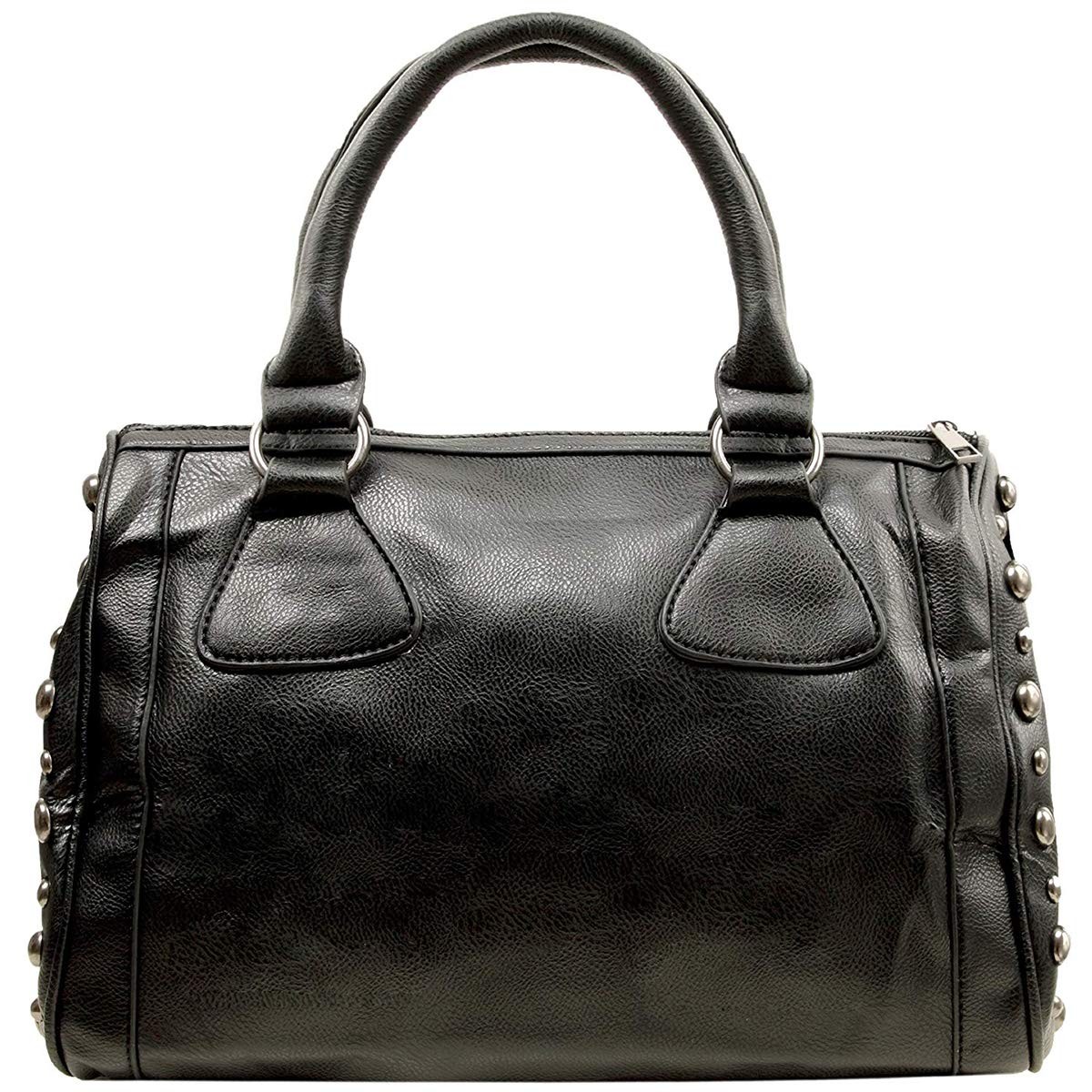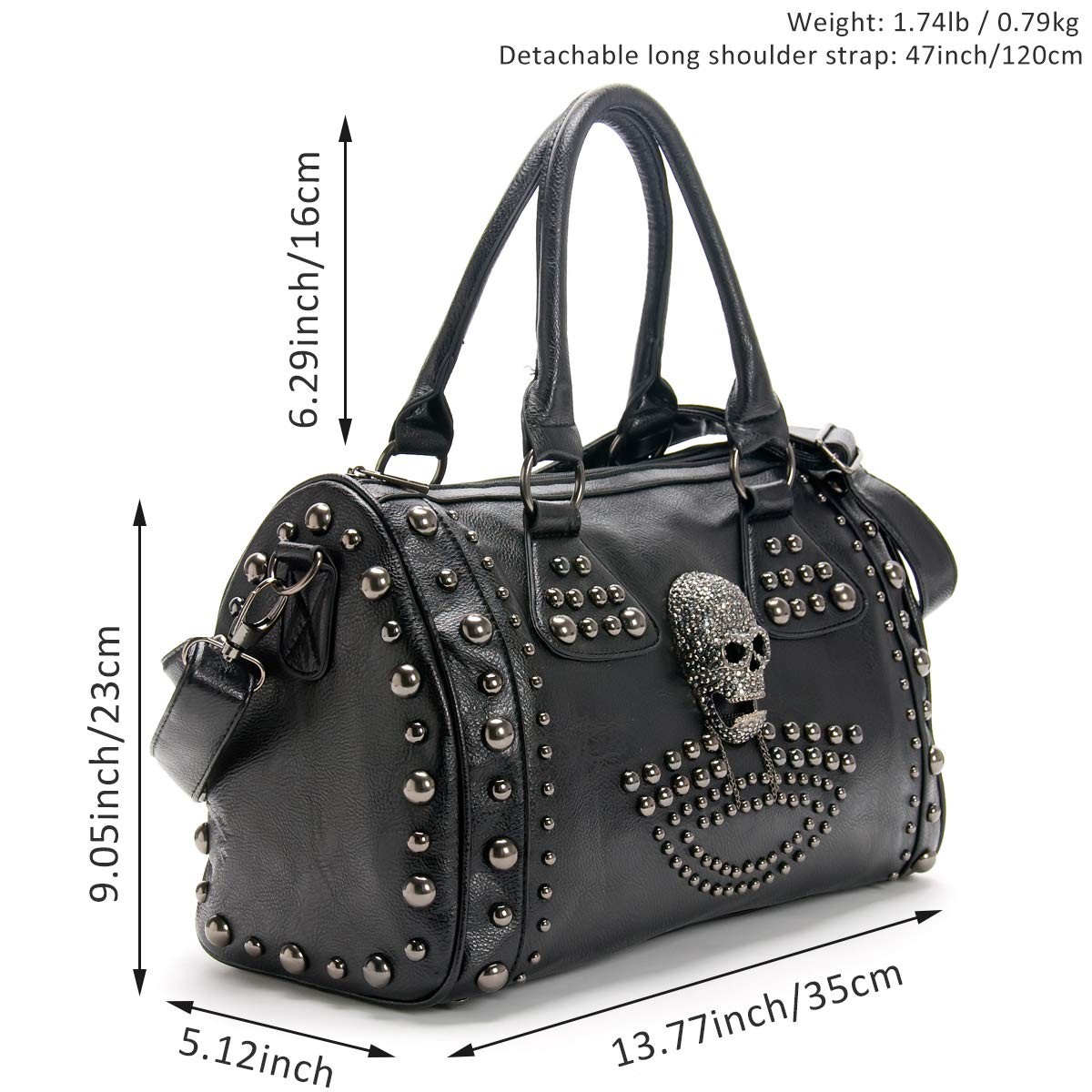 Gothic Punk Style handbag embellished with edgy metal studs and a 3D skull head. Great gift for Halloween Christmas festivel. HIGH QUALITY - Ultra soft synthetic washed pu leather with heavy duty zipper hardware. 1 removable/adjustable shoulder strap. as a handbag / shoudle bag /crossbody bag. Every is ok! DIMENSION: Exterior - 9.5" H X 14" W X 5" D; Interior - 9" H X 13.7" W X 5" D; Handle - 6" drop; Shoulder Strap - 24" drop.der bag/handbag. Small tote bag for crossbody bag/shoulder bag. LARGE CAPACITY - Interior: 1 large zipper compartment contains 1 internal zip pockets and 2 open pockets. Exterior: 1 back zipper pocket. EXTREMELY PRACTICAL - Comfortably holds a 9.7" iPad Pro, tablet or a laptop 10" and under. Exterior pockets can hold your smartphone, cosmetic, hair band, house keys and other tiny items.