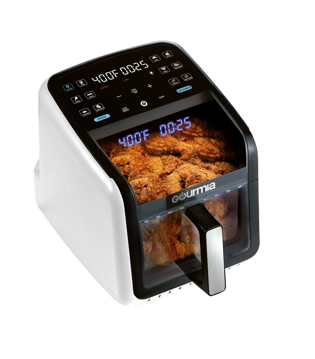 Effortless Cooking with Style: The Green Gourmias Air Fryer features a large 7-quart capacity and 12 one-touch cooking presets for fries, bacon, seafood, and more. Monitor cooking progress through its panoramic viewing window. Cutting-Edge Technology: Includes FryForce 360° Technology for even, oil-free crispy cooking and a 3D holographic display that projects time, temperature, and reminders for a user-friendly experience. Enhanced Usability: Guided cooking prompts ensure flawless operation, and optional preheat/turn reminders make this air fryer ideal for beginners and experienced cooks. Sleek design in an eye-catching green color. Easy to Maintain: Includes a dishwasher-safe nonstick basket and crisper tray, making cleanup fast and hassle-free. Crafted with durable materials to ensure consistent performance over time. Powerful and Versatile: With 1500 watts of power, adjustable temperature from 250°F to 400°F, and compact dimensions of 17.4 x 13.4 x 13.9 inches, this air fryer is a perfect addition to any modern kitchen.