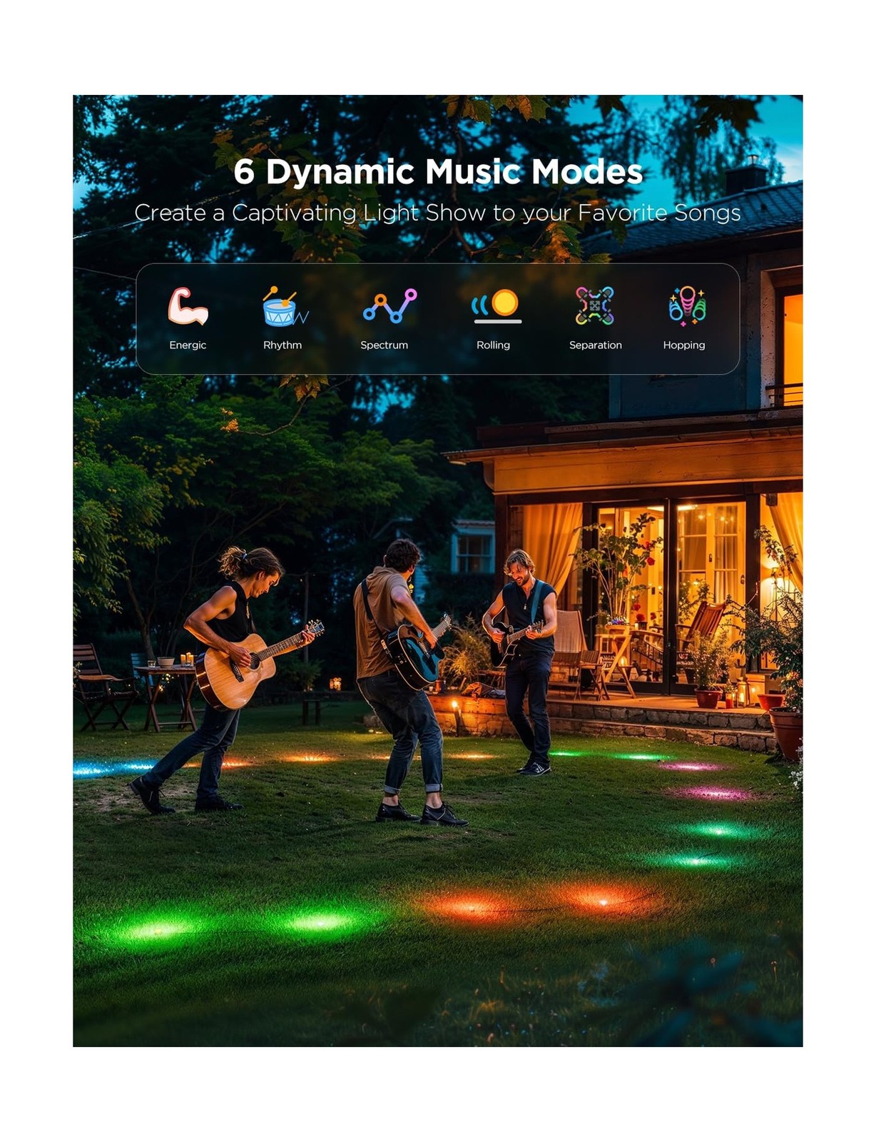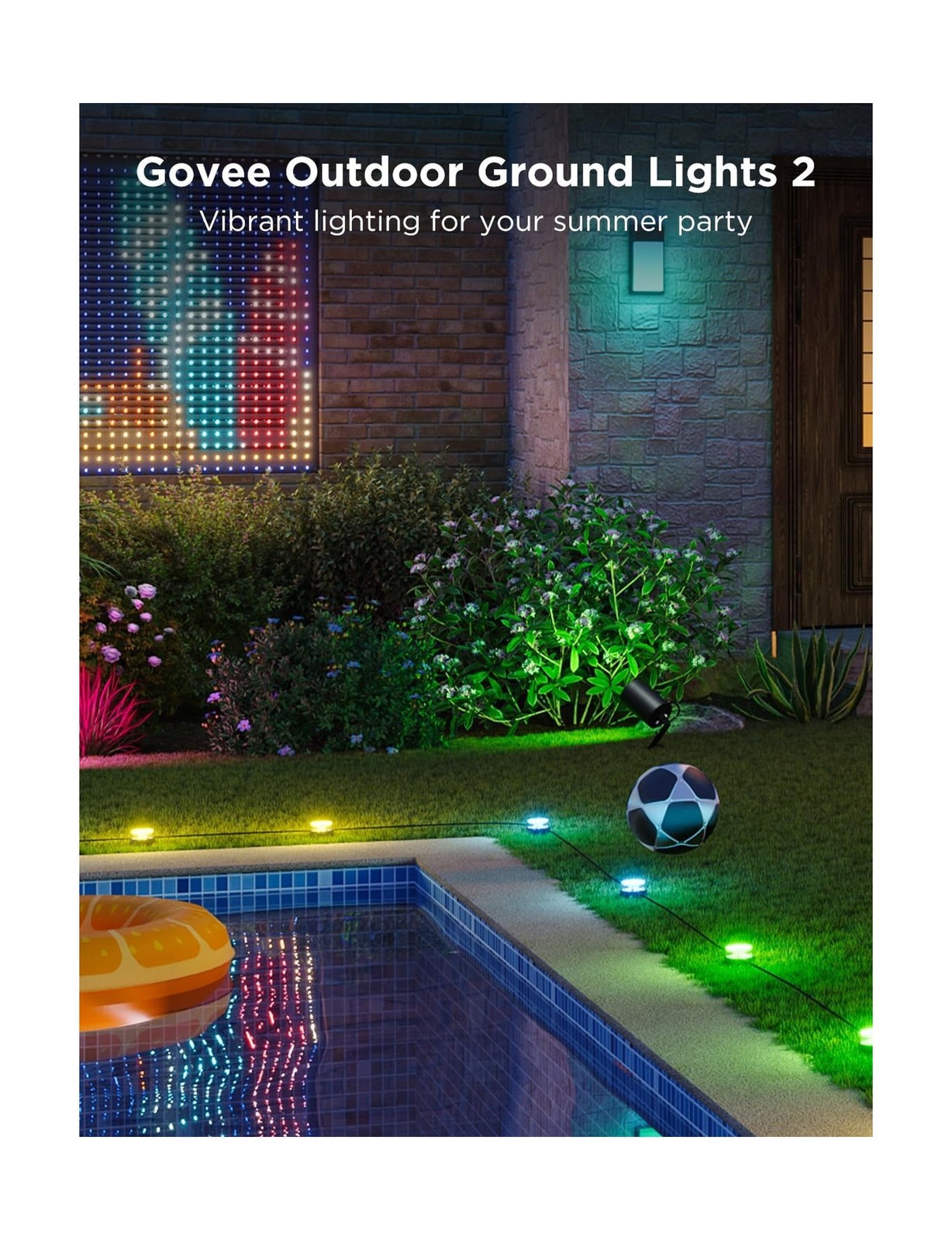 Govee Outdoor Ground Lights 2, 50ft Patio Decorations, 15 Pack RGBIC Pathway Lights with 100LM Warm White, IP67 Waterproof, 63 Scene Modes, Works with Alexa, Google Assistant Description Features: Upgraded Lighting Effect: Govee Outdoor Ground Lights 2 have a reflective cover design, which makes the light radius cover more than 11 inches from the product base. The brighter and wider light coverage creates a better holiday outdoor decor. DIY Festive Lighting: With RGBIC+W technology, govee outdoor lights allow each pathway light to be set at different color. Enjoy upgraded patio decor with 16 million colors and 63 scene modes for any occassions. (Neither cuttable nor extendable) Year Round Protection: With IP67 control box and IP44 adapter, IP67 outdoor decor lights can be used for up to 25,000 hours in temperatures from -4F to 114F (-20C-45C), which makes your outdoor decorations durable and reliable. Firmer Installation: 50ft Govee Ground Lights 2 includes a 15 pack of ground lights and 16 pcs ground stakes. 2.9 inch extended stakes can create a more secure installation to the ground. Attach the stakes to the lights before staking the lights into the ground. Music Sync Mode: Govee garden decor lights can sync light effects to the beat of music, creating a colorful light feast with your favourite songs. Celebrate with your family in your yard with vibrant lighting effects for holiday parties. Product Details: Brand: Govee Color: Black Material: Plastic Style: Modern Light fixture form: Path Brand: Govee Color: Black Material: Plastic Style: Modern Light fixture form: Path Room Type: Outdoor Product Dimensions: 1.73"L x 1.73"W x 1.02"H Specific Uses For Product: Walkway Indoor/Outdoor Usage: Outdoor Power Source: AC/DC Installation Type: Ground Mount Special Feature: Waterproof Control Method: App, Voice Light Source Type: LED Finish Type: Textured Shade Material: Plastic Number of Light Sources: 15 Theme: Summer Party, Holiday Light Color: Multicolor Included Components: Light kit Lighting Method: LED Number of Items: 1 Wattage: 30 watts Bulb Base: E26 Switch Type: No Switch Unit Count: 15.0 Count Water Resistance Level: Waterproof Connectivity Protocol: Bluetooth, Wi-Fi Brightness: 100 lumen Efficiency: 3.33 lumens per watt Mounting Type: Ground Mount Shade Color: Multicolor Fixture Type: Removable Assembly Required: No Manufacturer: Govee Size: 50ft UPC: 810088348167 Light Output Maximum: 100 Lumens Model Name: H7052 Set Name: Govee Outdoor Ground Lights 2 Part Number: H7052111 Item Weight: 4.18 pounds Item model number: H7052 Finish types: Textured Special Features: Waterproof Batteries Included?: No Batteries Required?: No Date First Available: April 20, 2024 Delivery We Do Not Ship Outside of the Continental US. Return Policy All items qualify for returns within 30 days of receipt. Seller is responsible for return shipping on any item that is not damaged. Feedback We take our reputation seriously, we buy and sell online, so we understand the value of trust. If you are unsatisfied with your order, please contact us and we will work with you to resolve it to your satisfaction.