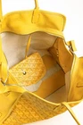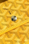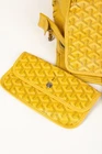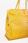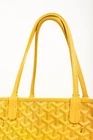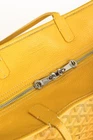 The Hardy PM bag from Goyard is crafted with the designer's Goyardine canvas in a bright Yellow, and is trimmed in a tonal decize taurillon leather. It features palladium-plated hardware, two top handles, "Goyard Paris" perforated leather gussets, and bottom leather feet. Fashioned with double sliders, the top zip closure opens to a spacious interior containing a removable base, and a removable flap pouch. Condition: Excellent; very light marking on exterior, very light corner rub, some cracking on handle bases, some discolouration on bottom trim, very minor signs of wear on interior. comes with dustbag. Approximate measurements: Height: 11.5" (29 cm) Width: 16" (40.5 cm) Depth: 6.75" (17 cm) Handle Drop: 7" (18 cm) Composition: Coated canvas, leather trim, metal hardware.