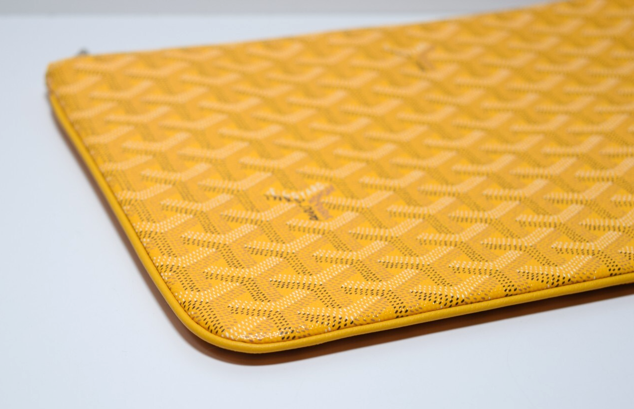 Condition: Excellent Accessories : Dust Bag / Includes Certificate of Authenticity from Entupy. Measurements: Height 8", Width 11.5", Depth 1", Designer: Goyard Model: Senat Zip Pouch Coated Canvas MM Exterior Material: Canvas Coated Exterior Color: Yellow Interior Material: Fabric Interior Color: Yellow Hardware Color: Silver
