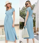 Grace Karin maxi dress Size medium Light blue Polyester, viscose V neck with hidden snap button Elastic waist with drawstring Pull on Surplice layer (high slit) Short sleeve Flowy Perfect for casual, party, travel, date night, beach, gathering, baby shower Flat lay measurements (approx)- Length: 54.5 in Chest: 17 in Waist: 14 in Preowned, good condition **Offers are welcome **Ship within 1-2 days **Smoke free environment