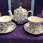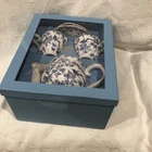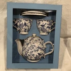 This five piece tea service set from Grace Tea Ware is made of fine porcelain. Beautifully designed with a blue floral pattern with birds against a white background. Comes in a 13” x 10” x 7” sturdy blue gift box.