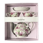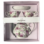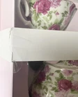 Lovely Grace Teaware boxed teaware gift set in a delicate pink, rose floral pattern with gold colored trim. Crafted in fine porcelain New, boxed set includes : Elegant teapot with lid 2 footed tea cups with matching scalloped saucers This is a wonderful set to enjoy with a companion or makes a great gift. Please Note: The box shows some slight wear due to storage, handling which may include creasing, small torn corner and or break in the clear top covering. It is very minimal and I have included packaging imperfection photos as well as both boxed sets that are currently listed. This is a lovely traditional new set