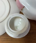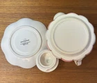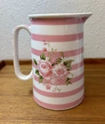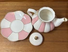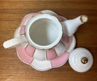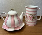 This stunning tea and coffee pot set with Pitcher from Grace Teaware is a must-have for any coffee or tea drinker! The porcelain material is beautifully crafted with a wide stripes pattern in pink and white with gold accents making it a perfect addition to any tea or coffee time decor. The set includes a gorgeous teapot with lid, matching underplate and 20 oz pitcher. The 16 oz teapot’s height is 5.5", width is 5.25” including the handle and spout. The set is an original studio-crafted production style of art pottery, and it features a glossy finish with gold trim. The set is also dishwasher safe, making it practical for everyday use. This tea and coffee pot set is perfect for anyone who loves to entertain guests or add a touch of elegance to their home decor. It almost makes one look forward to mornings! ;-) This set is in excellent preowned condition. There is a bit of wear on the underplate. As always, feel free to ask questions, ask for more photos or send us an offer! And if you have a minute, check out our other cool stuff as we always offer combined shipping !
