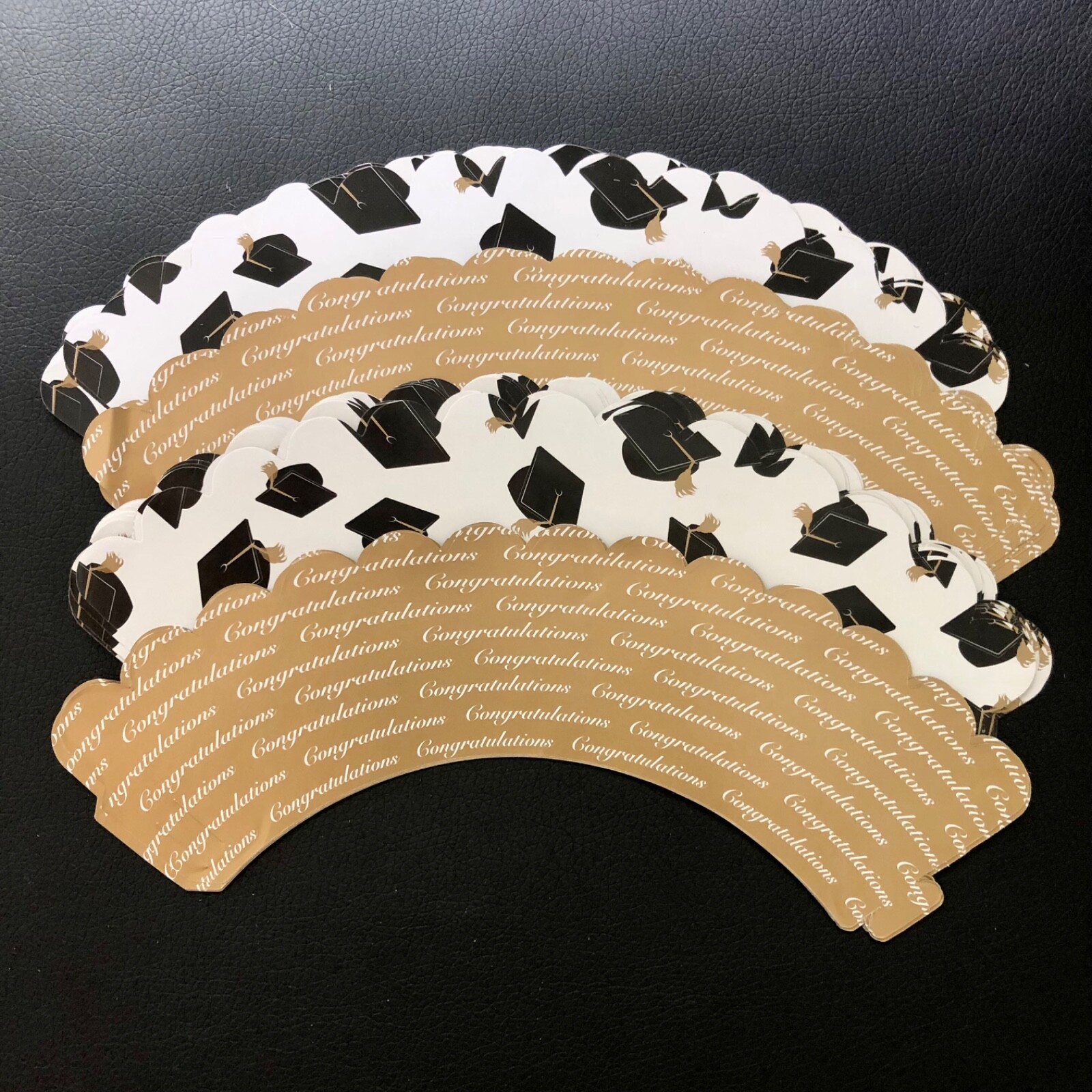 60 count 2 in 1 reversible graduation cupcake wrappers. These are for decoration only and must not be placed in the oven. Packaged flat but are easily assembled.