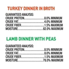 Your dog will be tasting a piece of the good life when you fill up their bowl with this Grain-Free Wet Dog Food Variety Pack. Moist, tender, and irresistibly delicious are just a few words your pup might use to describe this hearty meal if they could talk. This 12-pack includes six trays of Turkey Dinner in Broth and six trays of Lamb Dinner with Peas. For the best ingredients, pure and simple, pick up the Grain-Free Wet Dog Food Variety Pack today. At , we believe in one idea – the best nutrition for your pet starts with ingredients you can trust. Each of our super premium recipes are made with natural ingredients with added vitamins, minerals and other nutrients to your pet gets the nutrition they need. Its the way. Pure and Simple. Grain-Free Wet Dog Food Variety Pack, 3.5 oz Trays, 12 Count Includes 6 Turkey Dinner in Broth and 6 Lamb Dinner with Peas Moist and tender wet food for dogs in 3.5 oz trays No artificial colors The amount of food your dog requires will depend on activity, age, environment, and breed Feed at room temperature and refrigerate unused portions Always provide access to clean, fresh water