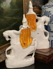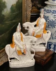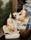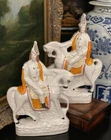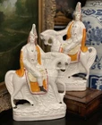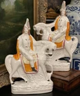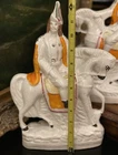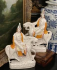 Wonderful Rare 19C Pair English Staffordshire Equestrian Mantle Flatbacks Depicting Elegant Horses in Noble Pose Carrying Prussian Military Figures in Traditional Dress • Elegant Antique Equestrian Staffordshire • Height 12” This pair of impressive large and extremely scarce gallery quality equestrian themed mantle flatbacks featuring elegant right and left facing horses carrying Prussian military figures in classic form from 19th century Staffordshire, England, will make elegant showpieces when placed on their own or as a stunning addition to a collection or arrangement. Excellent condition with minimal expected age related wear and minor original manufacturing underglaze anomalies and no post production breaks or repairs. Beautiful surviving examples. Truly stunning. * Listing is for pair horse with Prussian figures mantle flatbacks only. Other items are for display purposes. Height 12”