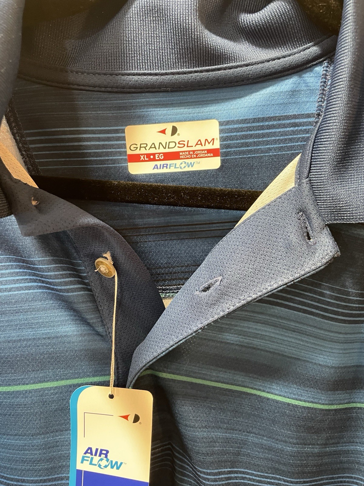 The Grand Slam Men's Polo Shirt in XL size features a classic fit with short sleeves and a striped blue pattern. Made of 100% polyester, this breathable shirt is machine washable and easy to care for. It is designed specifically for men who enjoy playing golf, with a focus on comfort and style. The shirt's chest size is 24.75 inches when laid flat, and it has a shirt length of 30 inches. With a button and logo accents, this Grand Slam polo shirt is a practical and stylish choice for any golfer.
