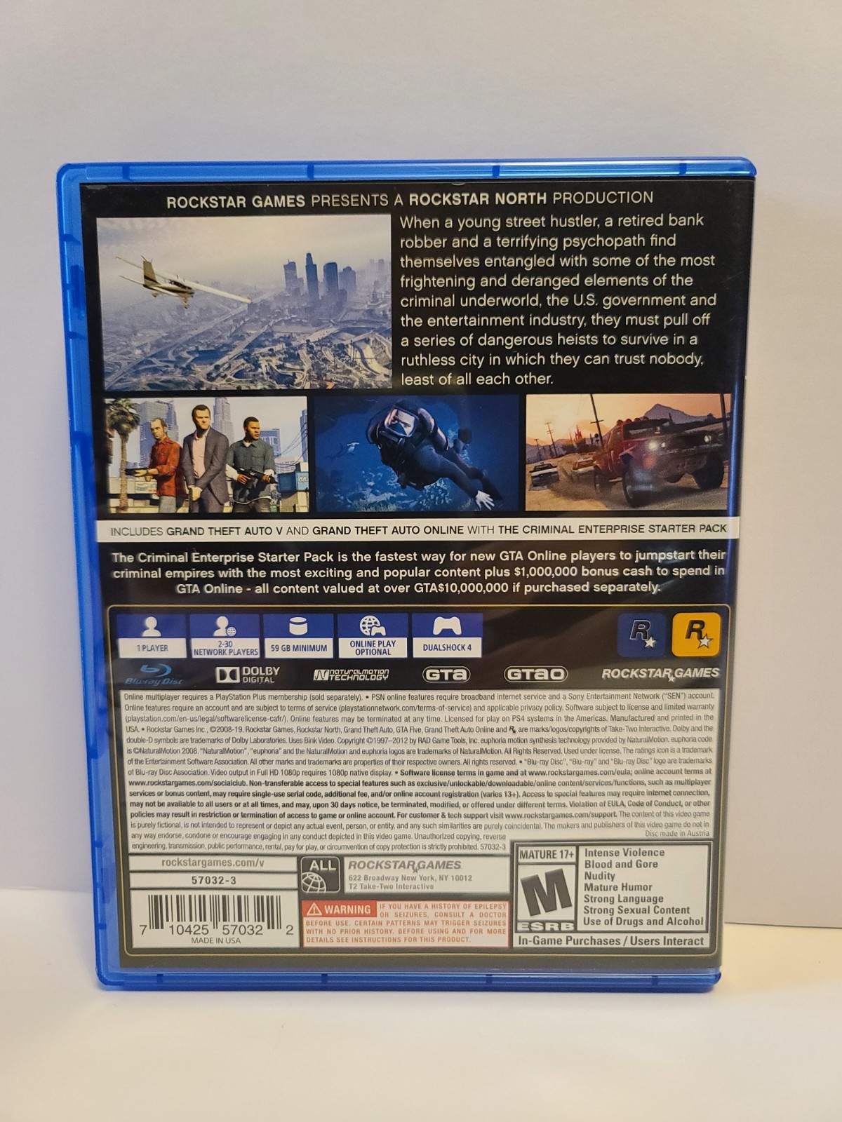Dive into the expansive world of Grand Theft Auto V Premium Edition for the Sony PlayStation 4, where action and adventure await at every turn. This edition comes complete with the original map and manual, enhancing your gameplay experience. The game is renowned for its gripping narrative and is a must-have for fans of the series. Crafted by Take 2 Interactive and 10tons, this game is rated M for Mature and promises hours of engaging gameplay. The item is region-coded for NTSC-U/C (US/Canada) and was released in 2018. With its compact dimensions of 6.72 in x 5.35 in x 0.57 in and a lightweight design at just 0.26 lb., it's a sleek addition to any gamer's collection.