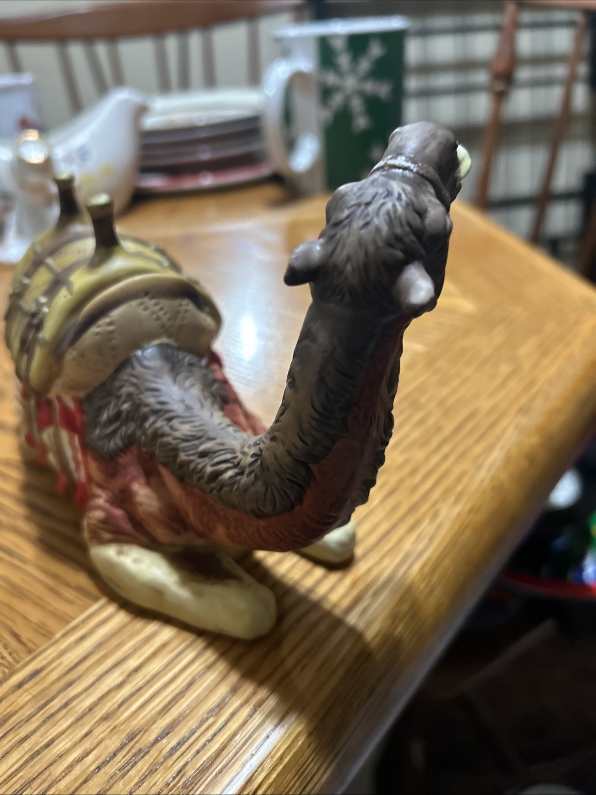 The Grandeur Noel Nativity by O'Well Novelty Co Camel N212A-1H Replacement Piece is a large, multicolored porcelain camel figurine designed for a Nativity scene. This vintage collectible, part of the Animals collection by Grandeur Noel, features intricate details and is perfect for those who appreciate religious-themed decor. It is an original piece from the 1990s, measuring 8 inches in length, 5 inches in height, and 3 inches in width. This Replacement Piece adds a touch of nostalgia and tradition to any Christmas display.