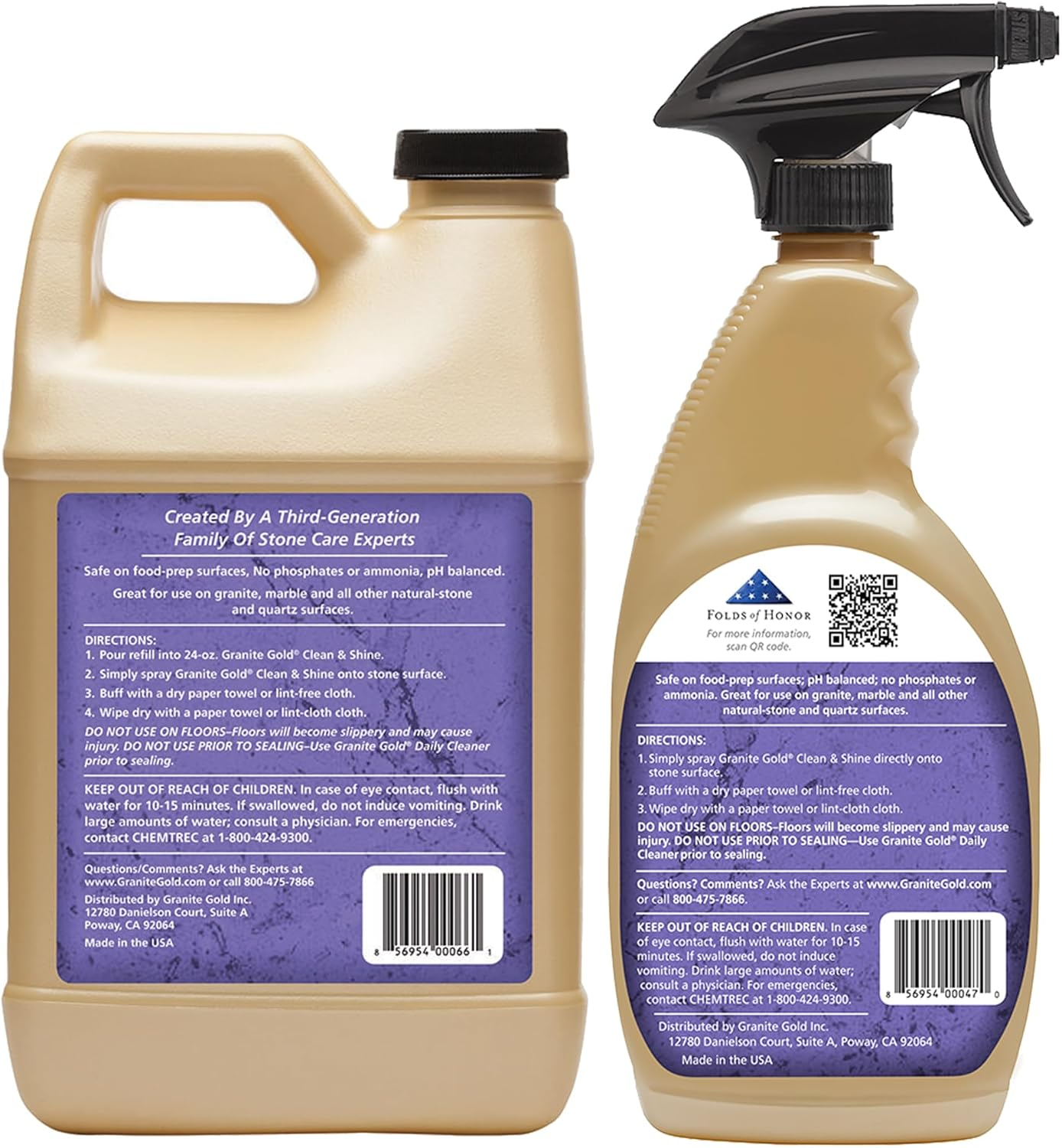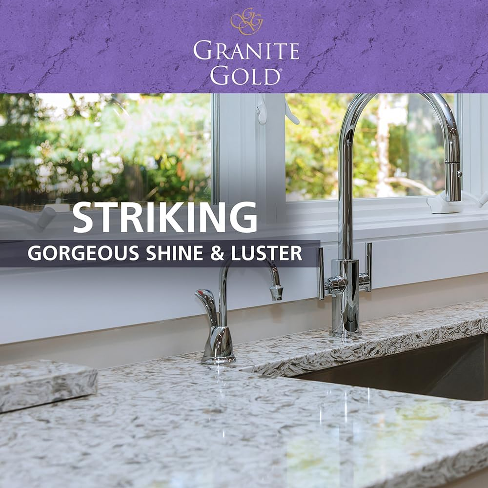 Stone Cleaner and Polish: A cleaner and polish in one, this formula easily removes all types of spills and soils from natural stone, leaving a fresh citrus scent and enhanced shine and luster; Value Pack includes 24-ounce spray bottle and 64-ounce refill Protect and Preserve: Specially formulated for granite, marble, travertine, limestone, slate, grout and all other natural stone; Use instead of everyday household cleaners that can damage natural stone and lead to expensive repair or replacement Safe and Easy to Use: This product comes in an easy to apply spray-and-wipe formula that's pH balanced and safe for food-preparation surfaces with no strong or harmful odors and no phosphates or ammonia Try Them All: We make it easy for you to clean and protect your natural stone and quartz surfaces including kitchen countertops, floors, and bathroom vanities; Try our Daily Cleaner, Polish, Grout Cleaner and more Stone Care Experts: Our products were created by a third-generation family of stone care experts and made in the USA, that's why we're the number one family brand of stone care products Quickly deep-clean granite and reveal your stone’s natural beauty in one convenient solution. A granite cleaner and granite polish in one, Granite Gold Clean & Shine combines the cleaning power of Granite Gold Daily Cleaner with the polishing strength of Granite Gold Polish for a quick and easy formula that cleans and polishes granite, marble, travertine and all other natural-stone and quartz surfaces. It quickly removes all types of spills and soils, leaves a fresh citrus scent, and enhances shine and luster.