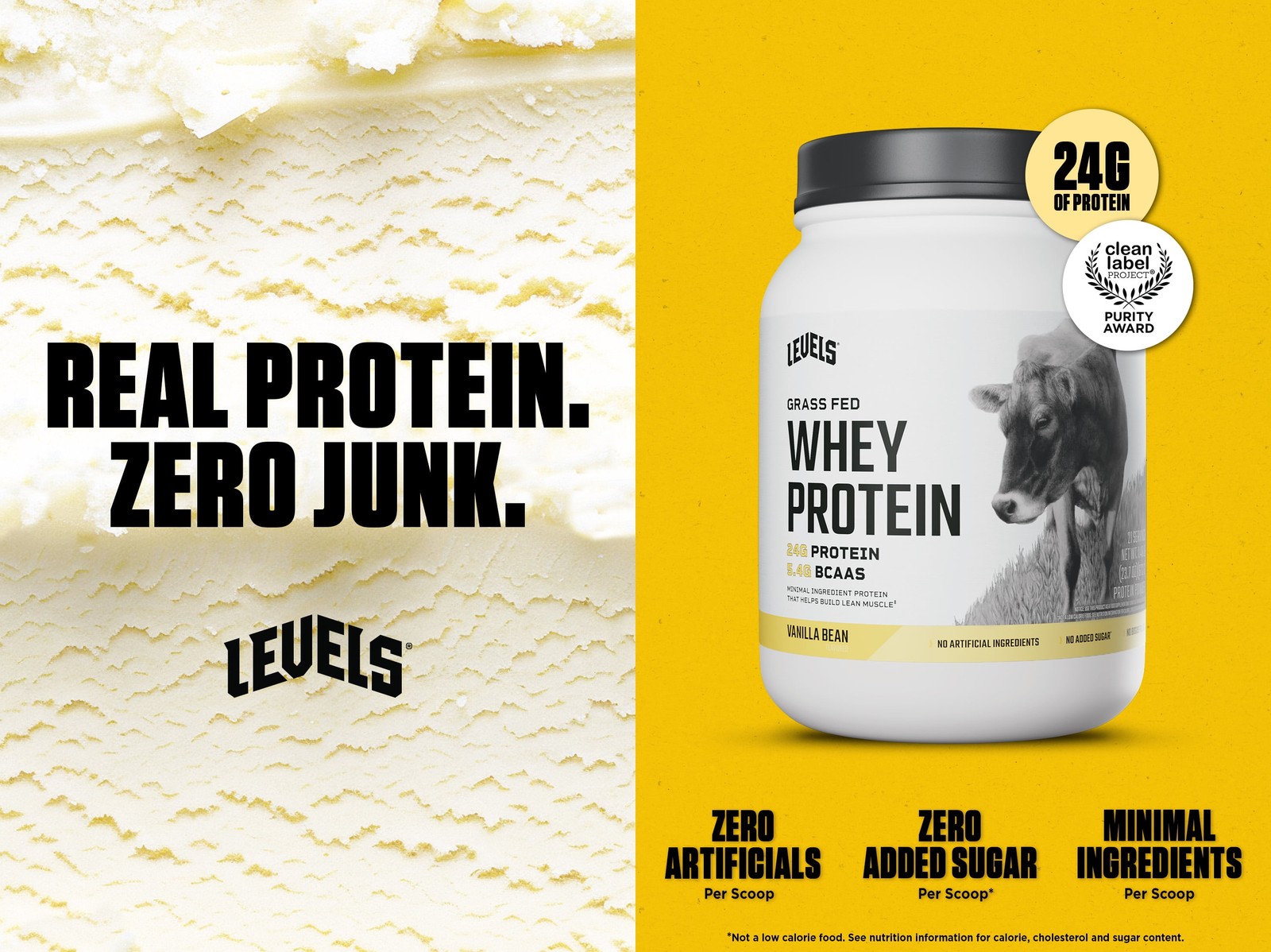 Real ingredients just taste better. That’s why we only use a blend of vanilla extract, natural sweeteners and hormone-free* whey. You’ll find no deception here either. That means no added sugars, no soy, no gluten, no artificial ingredients, and no bogus fillers. Made with minimal ingredients that don’t sacrifice on flavor. Whey concentrate is the least processed form of whey, which means it’s loaded with high-quality complete protein and essential amino acids. The branched-chain amino acids (BCAAs) found in whey protein can help build lean muscle and support post-workout recovery.‡ LEVELS WHEY PROTEIN: Each scoop of Levels Vanilla Bean Whey contains 24g Protein, 5.4g BCAAs (branched-chain amino acids), and no added sugars. Trusted by athletes, fitness enthusiasts and daily grinders everywhere, our whey is crafted for everyone’s lifestyle. NOTHING FAKE: Levels Whey is naturally delicious. That means no hormones, no GMOs, no added sugars, no soy, no gluten, no bleach, no fillers, and no artificial flavors or sweeteners. SIMPLE & CLEAN: No fake vanilla flavor here. Levels Vanilla Bean Whey is made with delicious Madagascar Vanilla Extract and lightly sweetened with monk fruit extract. QUALITY FIRST: Quality milk tastes better, way better. That’s why grass-fed hormone-free dairy is the only dairy we use to make our whey protein concentrate. Whey concentrate is the least processed form of whey, which means it’s loaded with high-quality complete protein and essential amino acids. Levels Whey Protein is undenatured to protect bioactivity and naturally occurring growth factors. Each batch is cold-process microfiltered and blended with non-gmo sunflower lecithin for that insanely easy mixing you expect. Ingredients Whey Protein Concentrate, Vanilla Extract, Sunflower Lecithin, Sea Salt, Stevia Leaf Extract, Monk Fruit Extract./div>